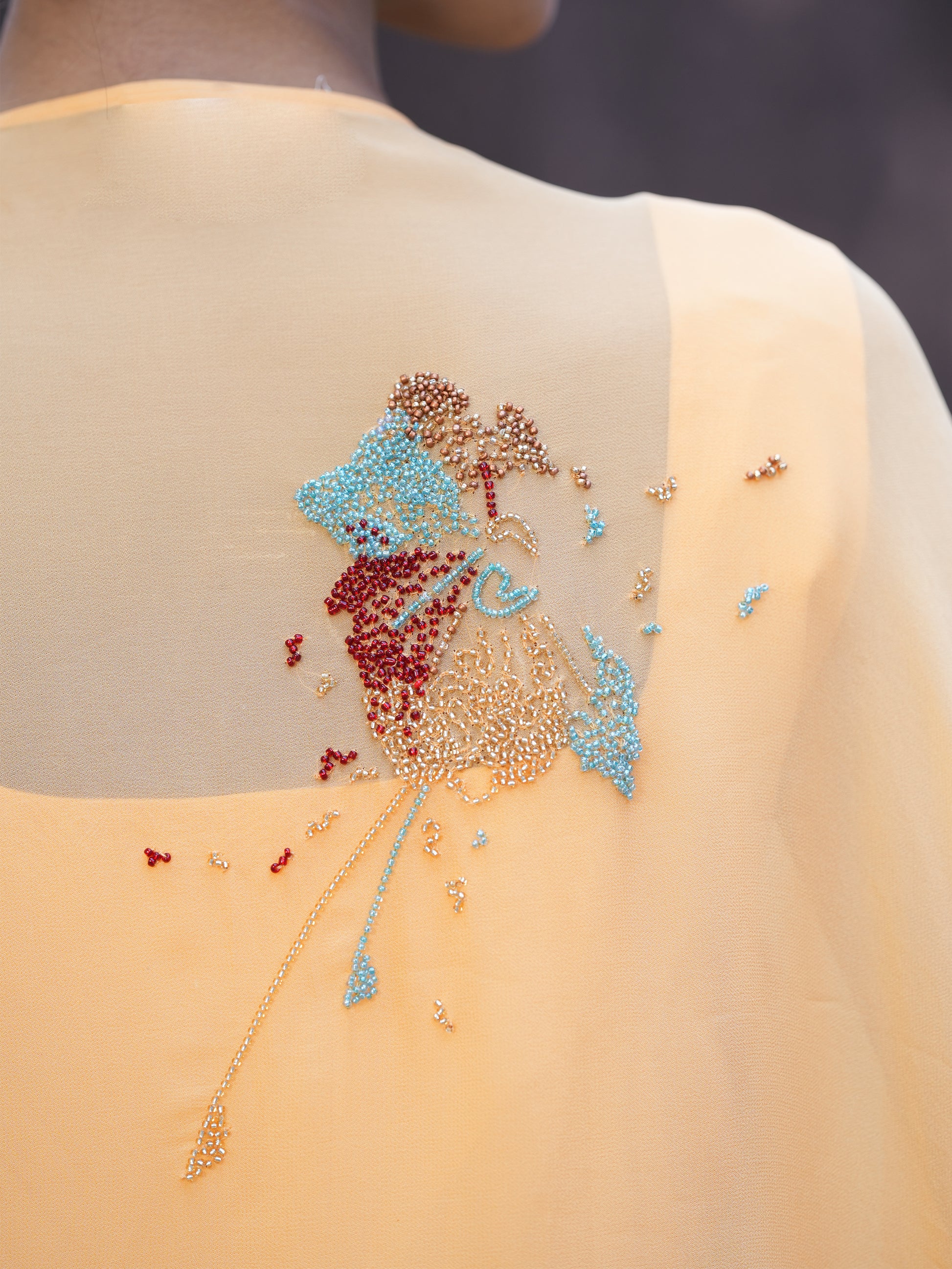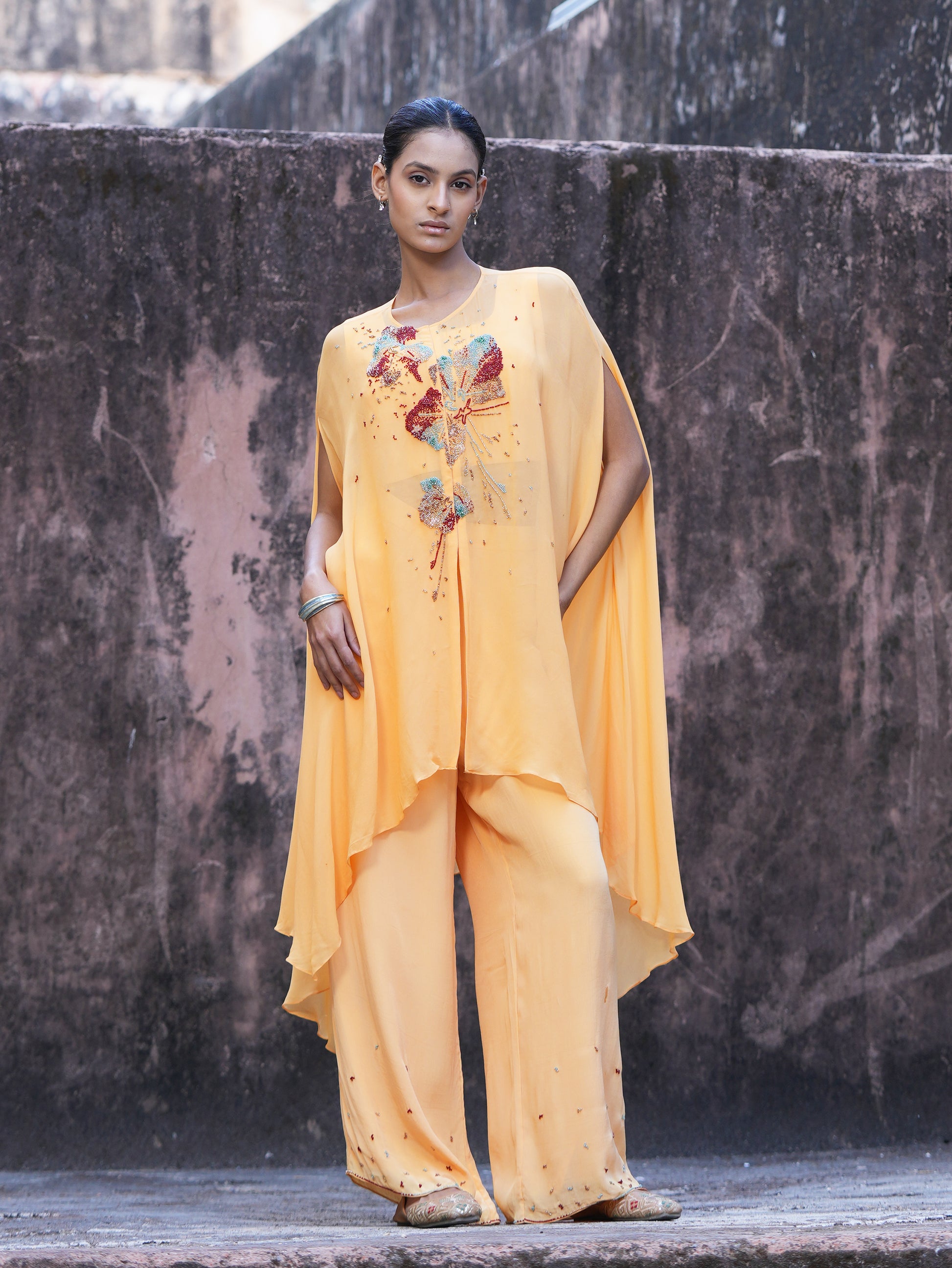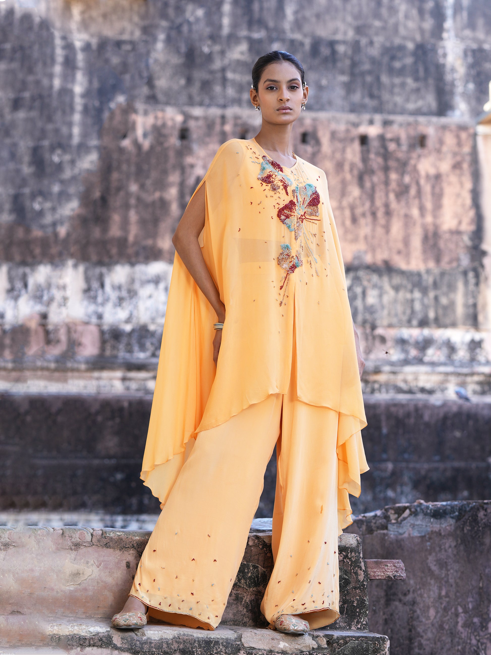 Cape set with an abstract floral artwork hand-embroidered in textural bead and crystal work. Paired with wide pants with details of matching embroidery. Comes with inner blouse.