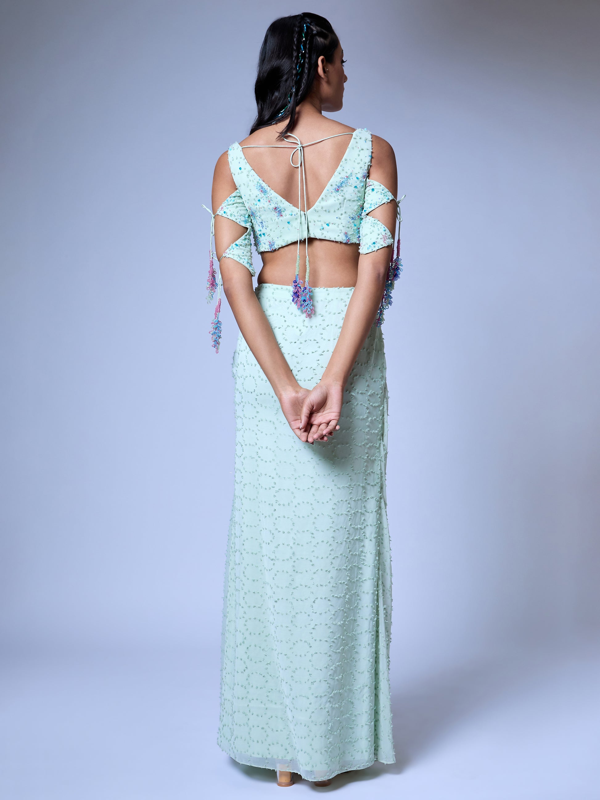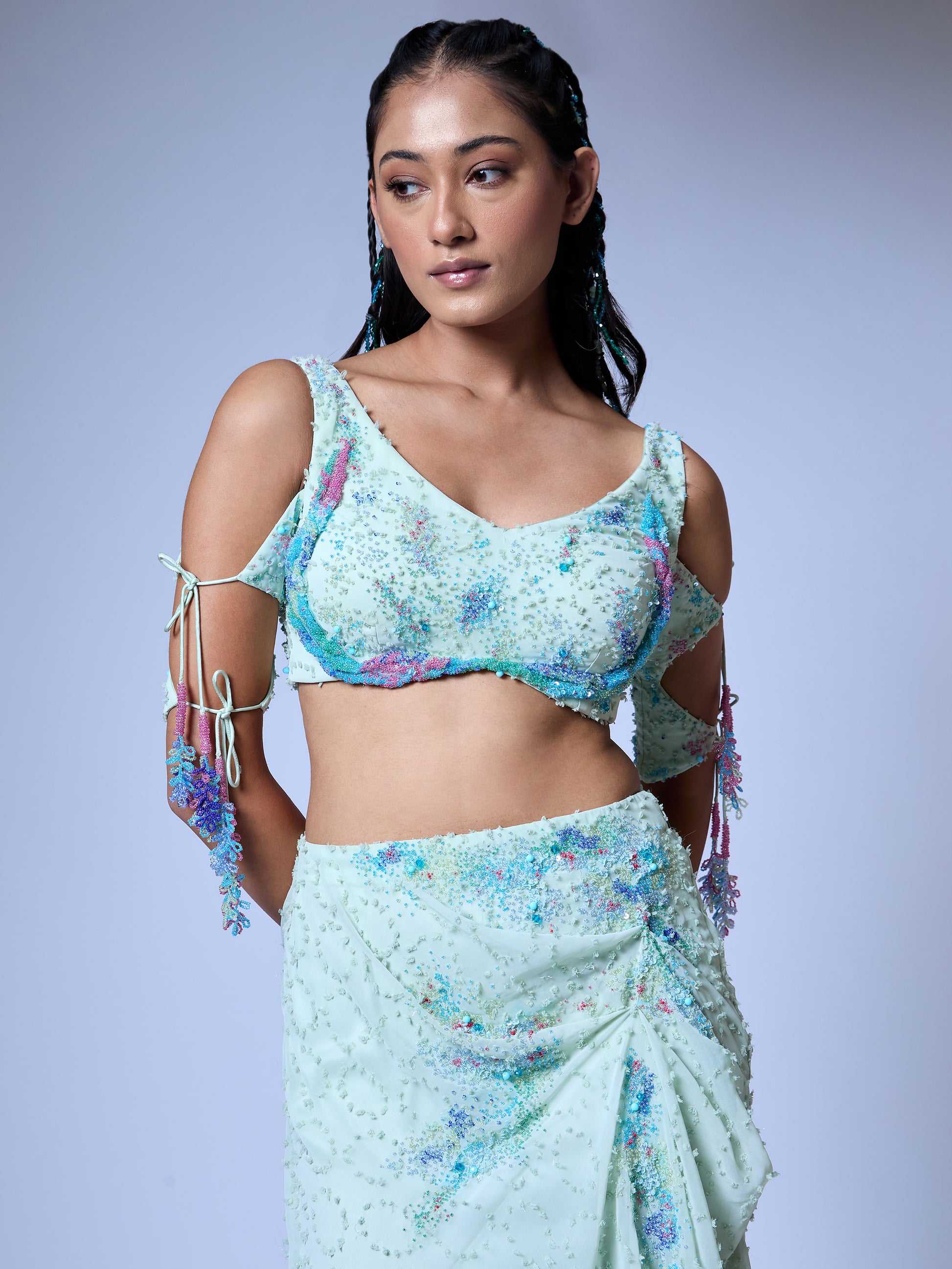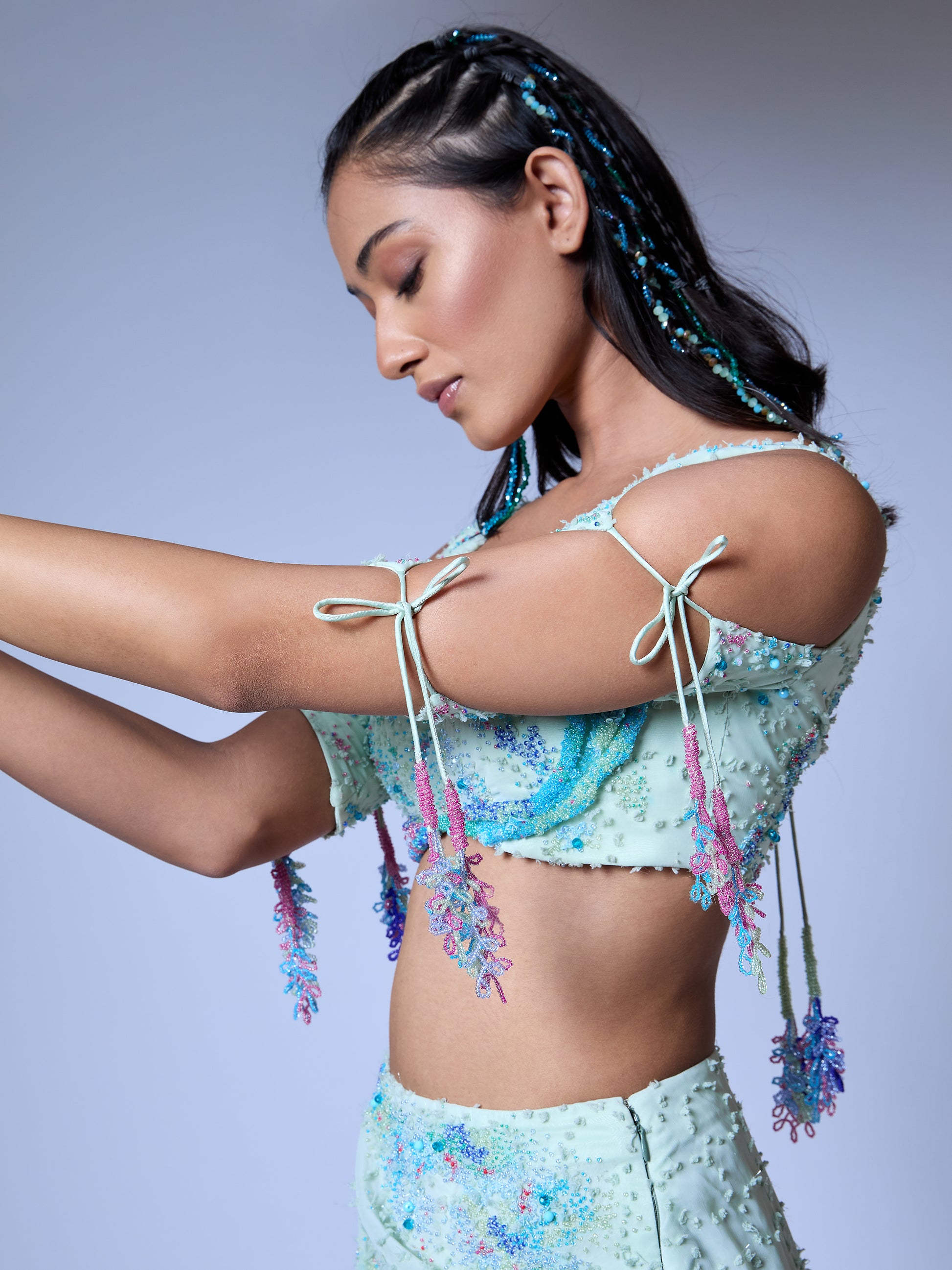 Bustier blouse in our signature 3D micro draping embroidery in seed beads, crystals and sequins. Tie-up sleeves with tassel detailing. Draped skirt in similar embroidery.