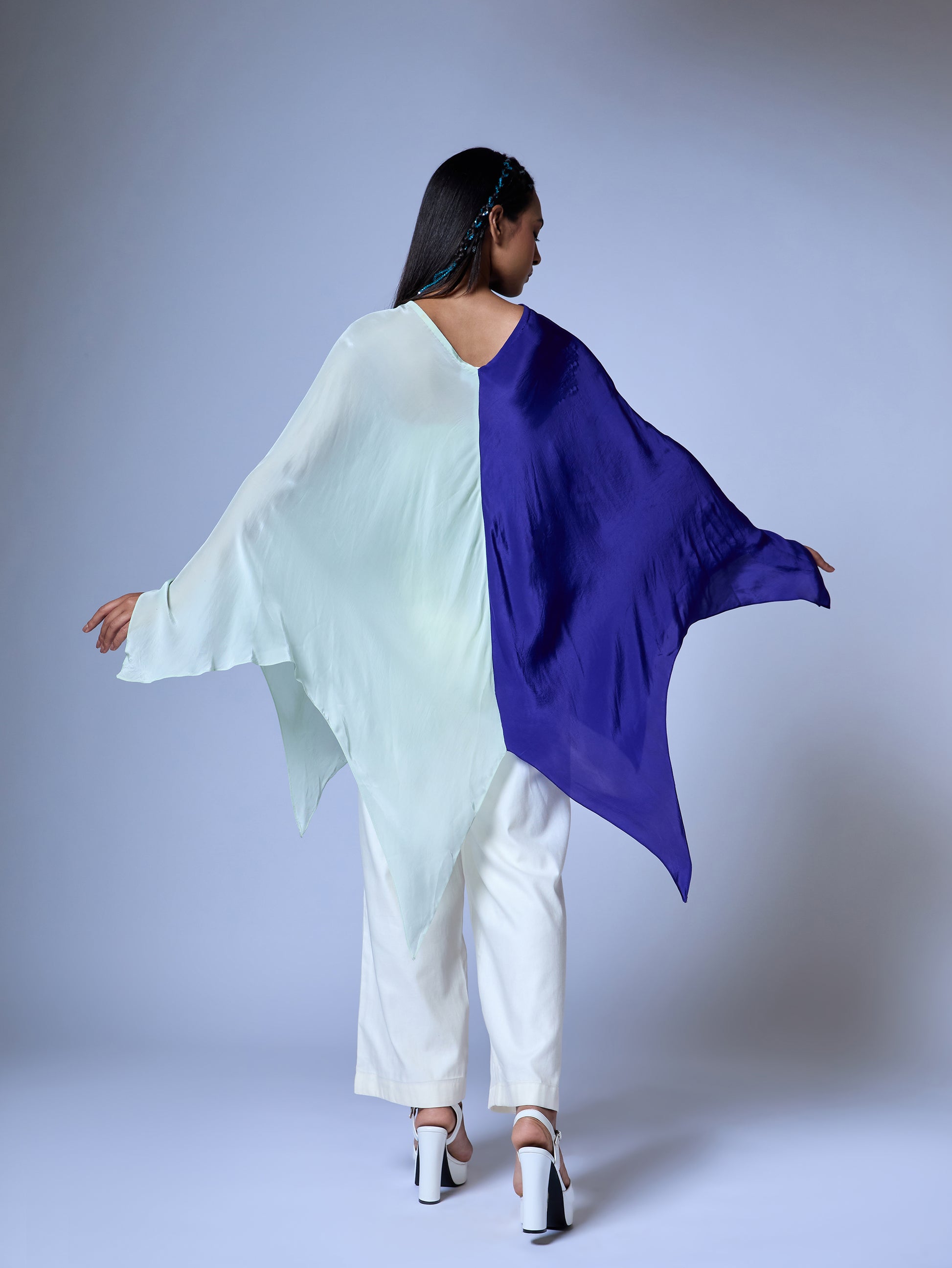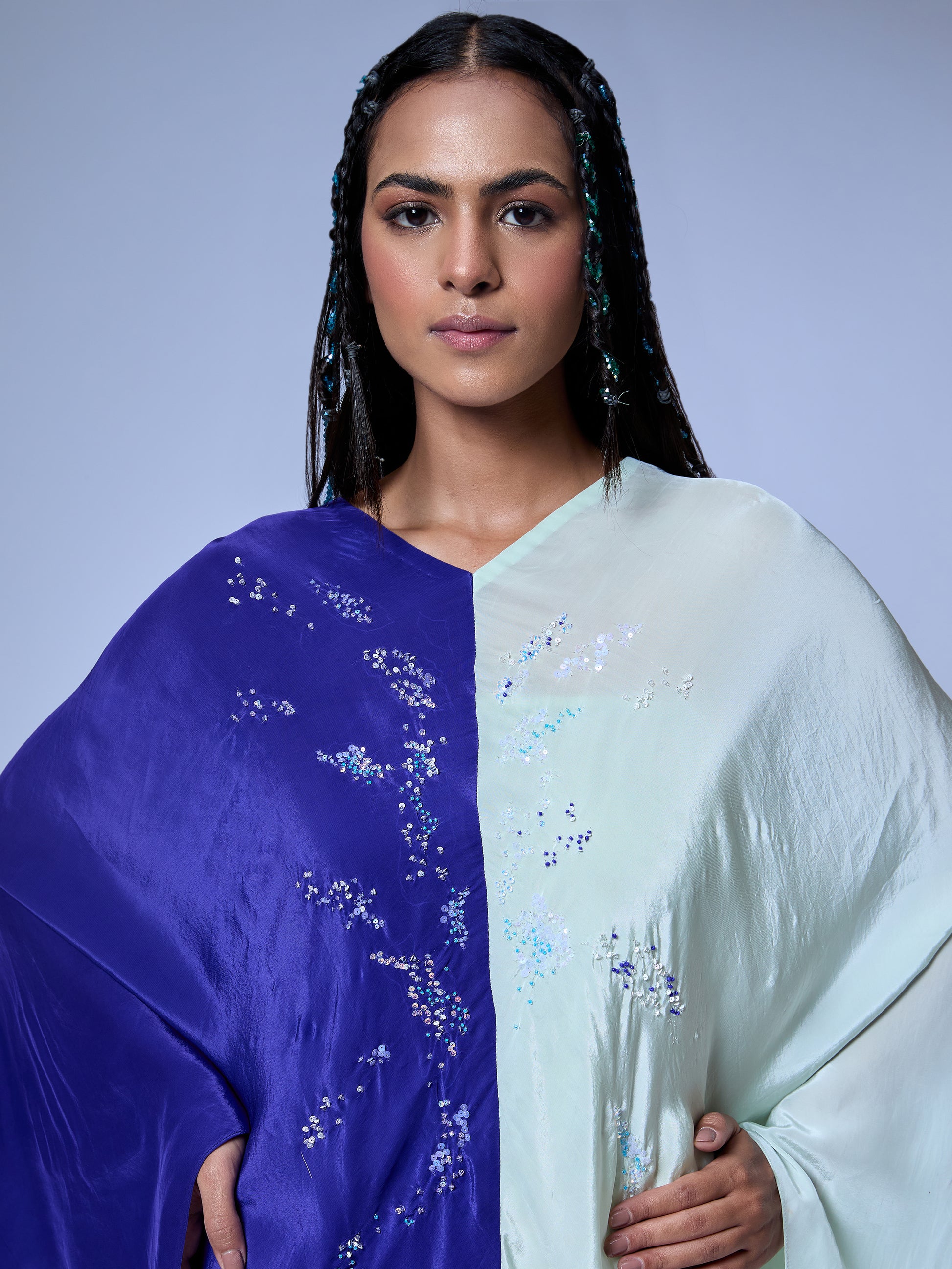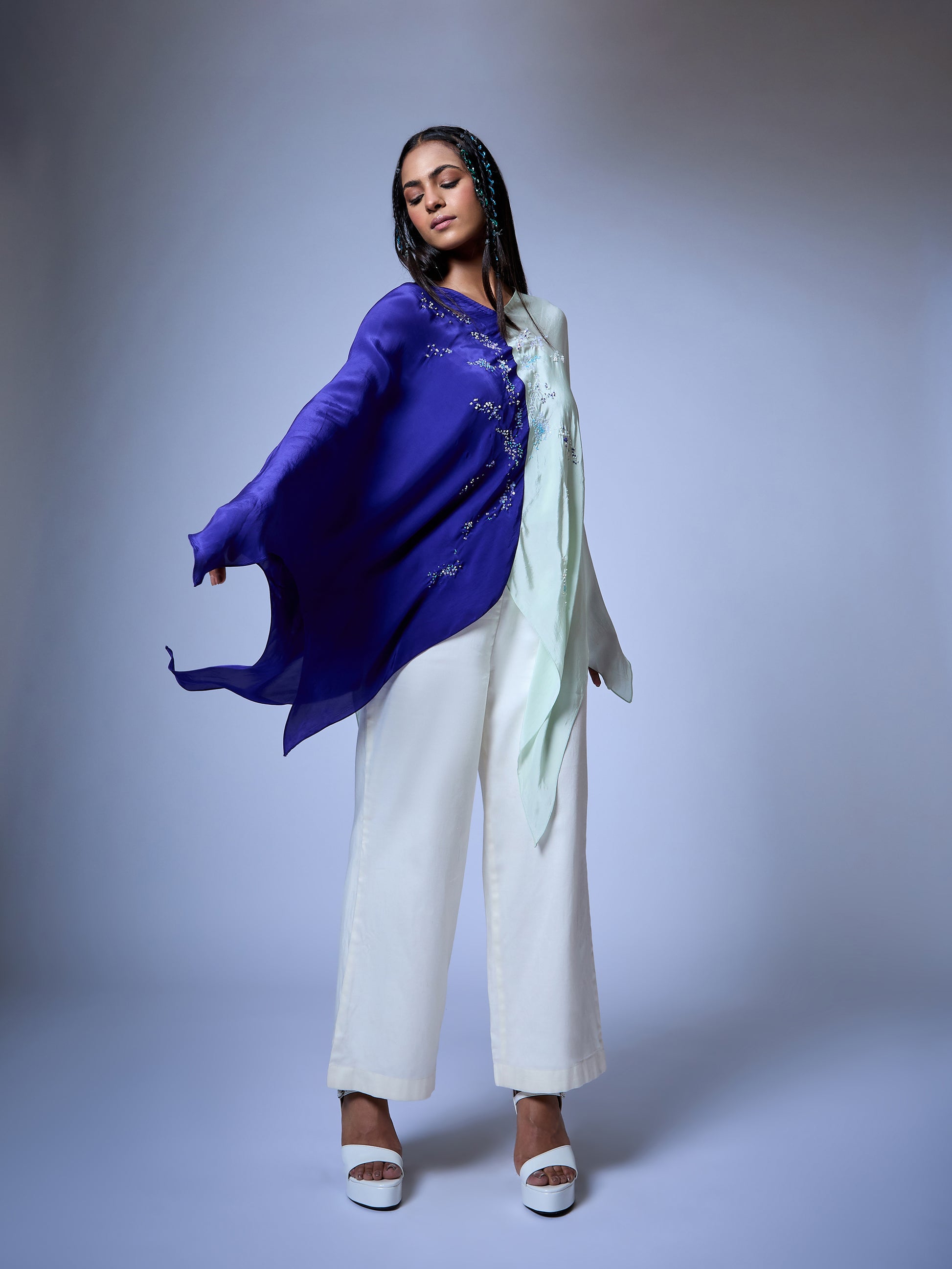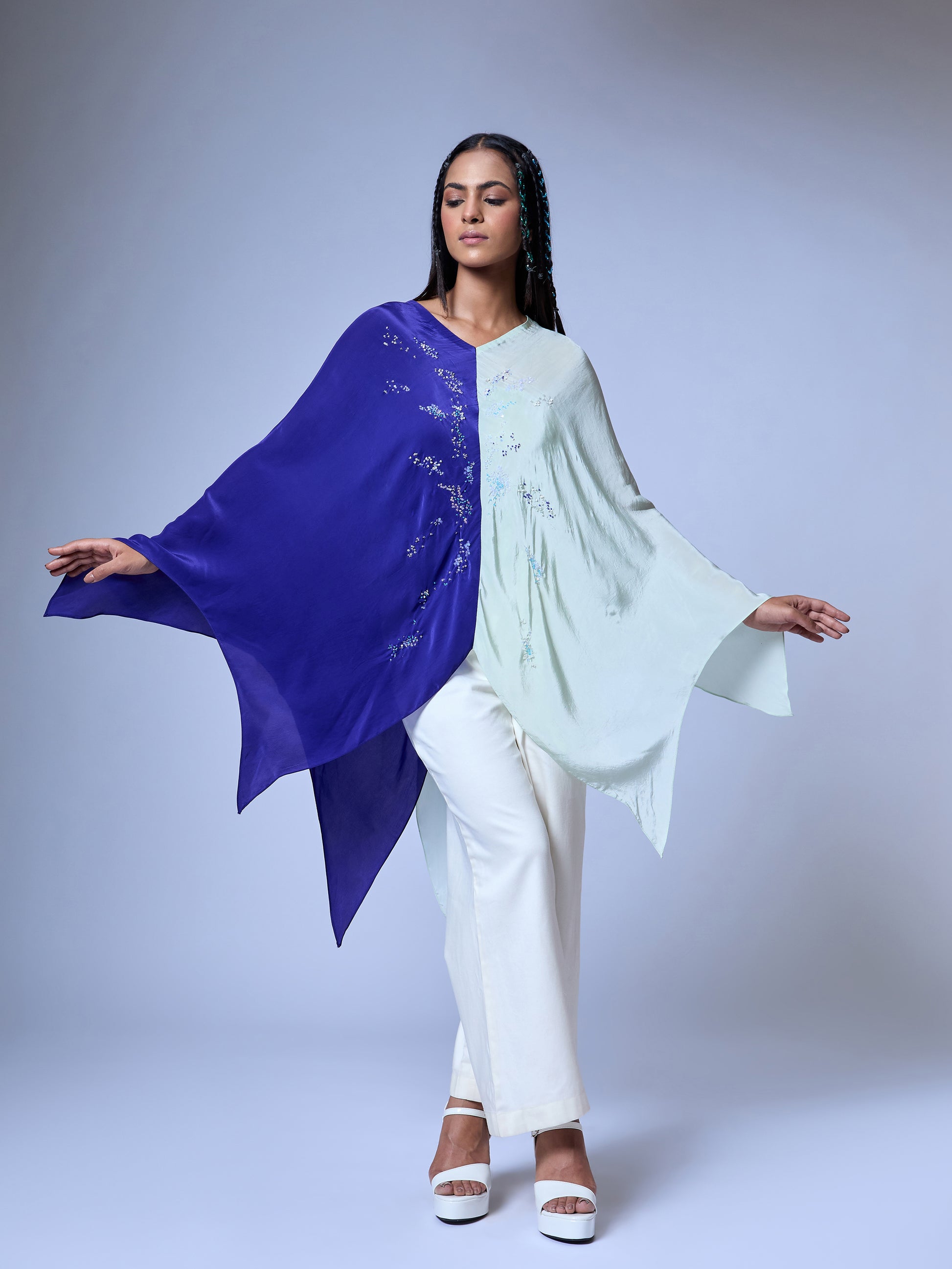 Draped top in scatter embroidery with sequin, beads and French knots. Cape sleeves with tassel details with dual shade.