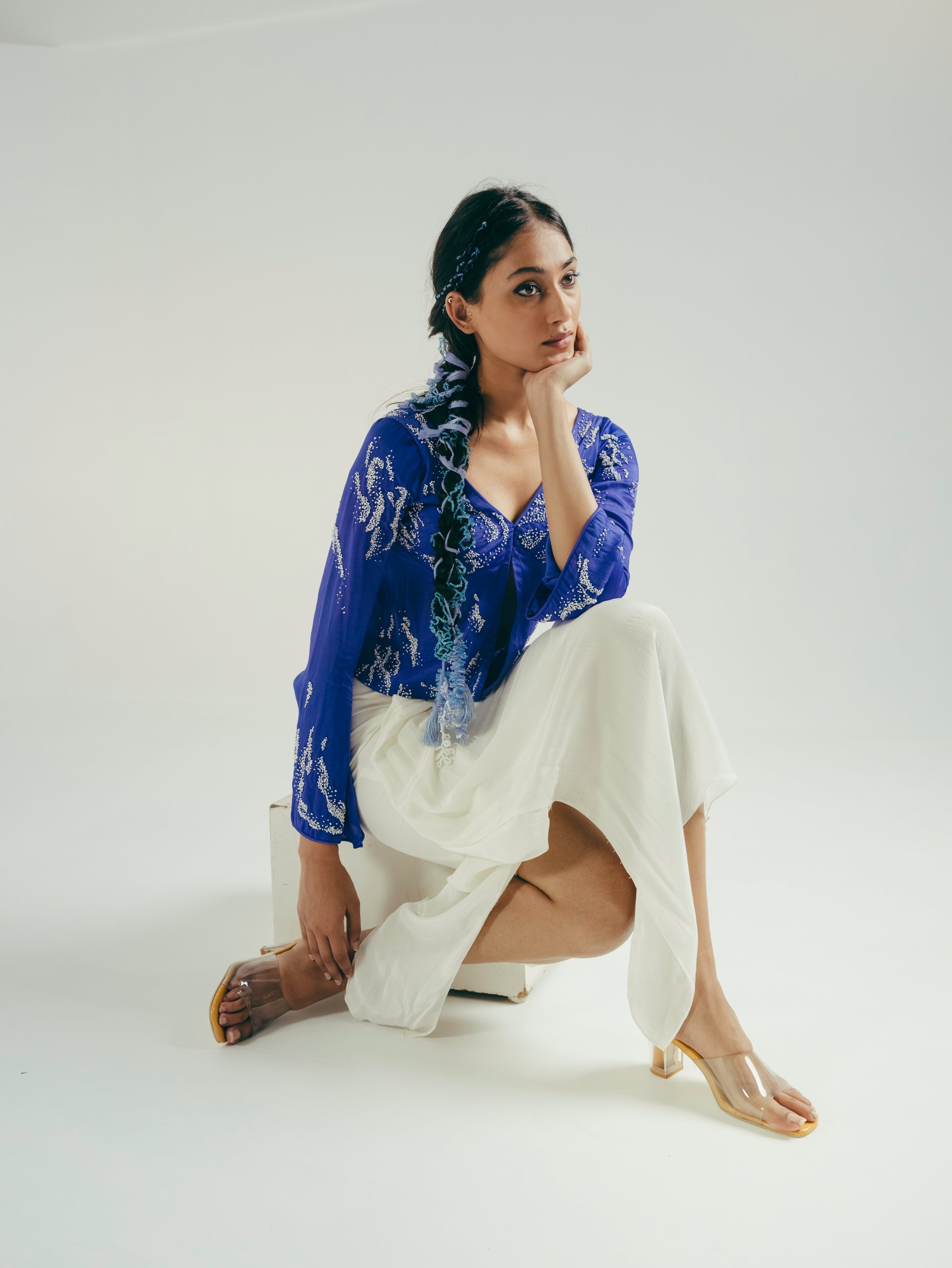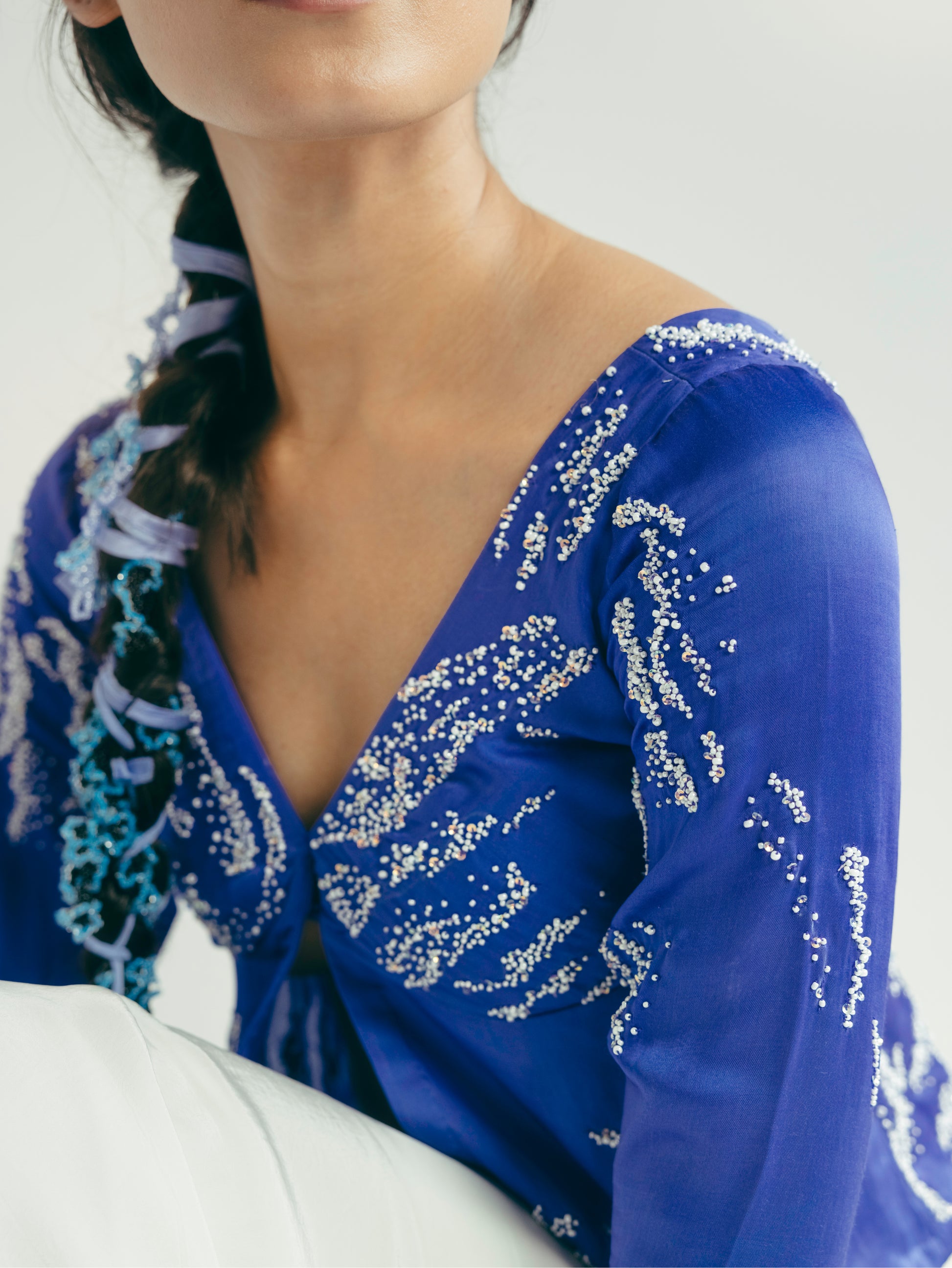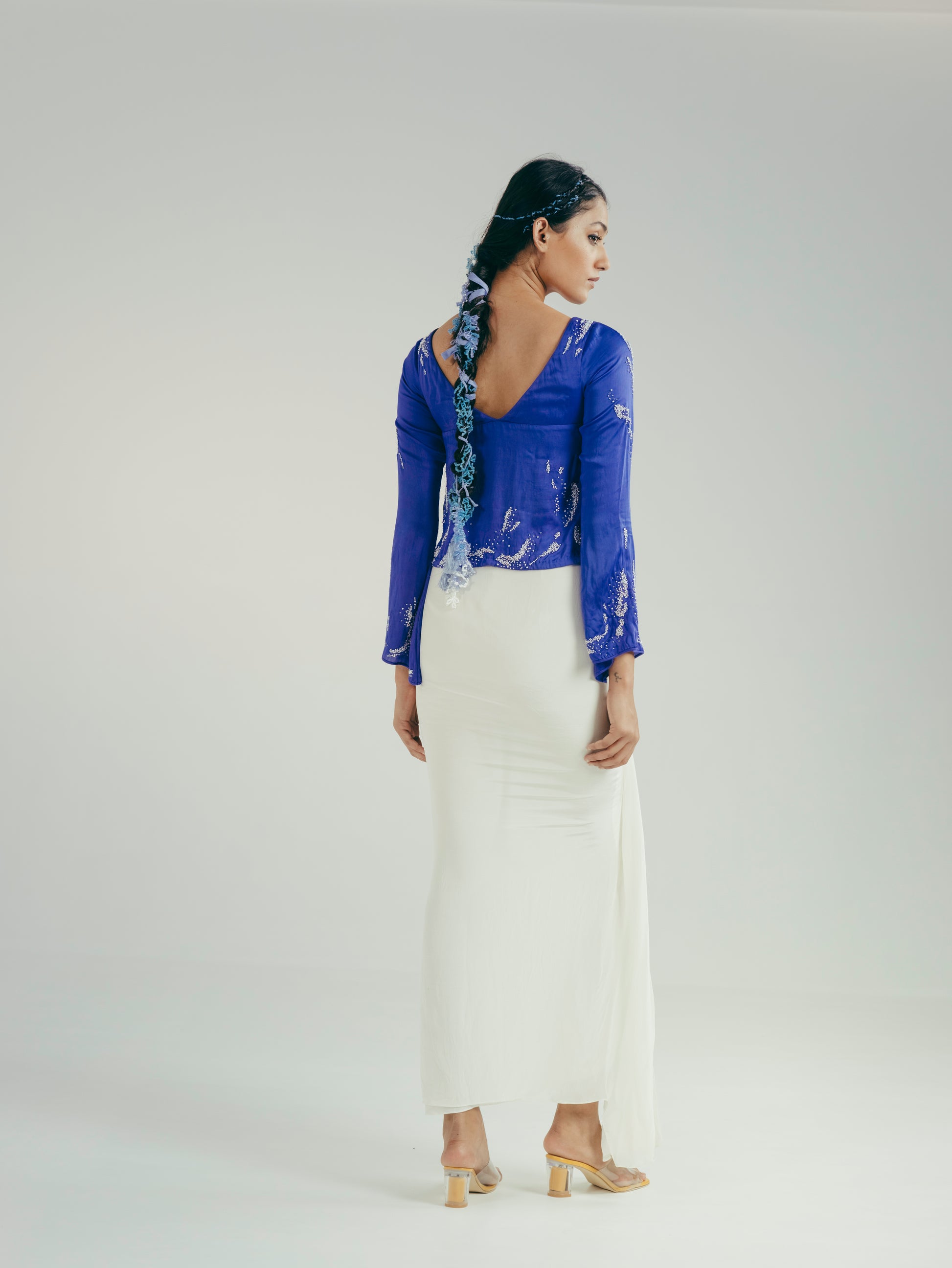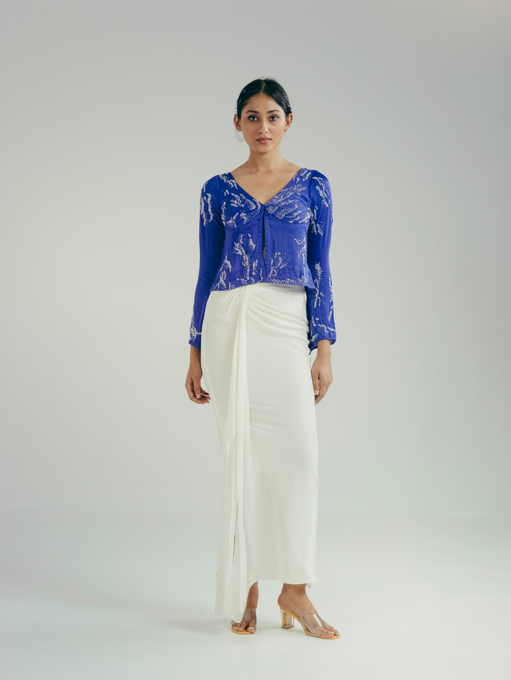 Full sleeved jacket top with bead and sequin textured embroidery. Centre front hook and eye opening. Maxi skirt with front drape. Side seam conceal zipper opening.