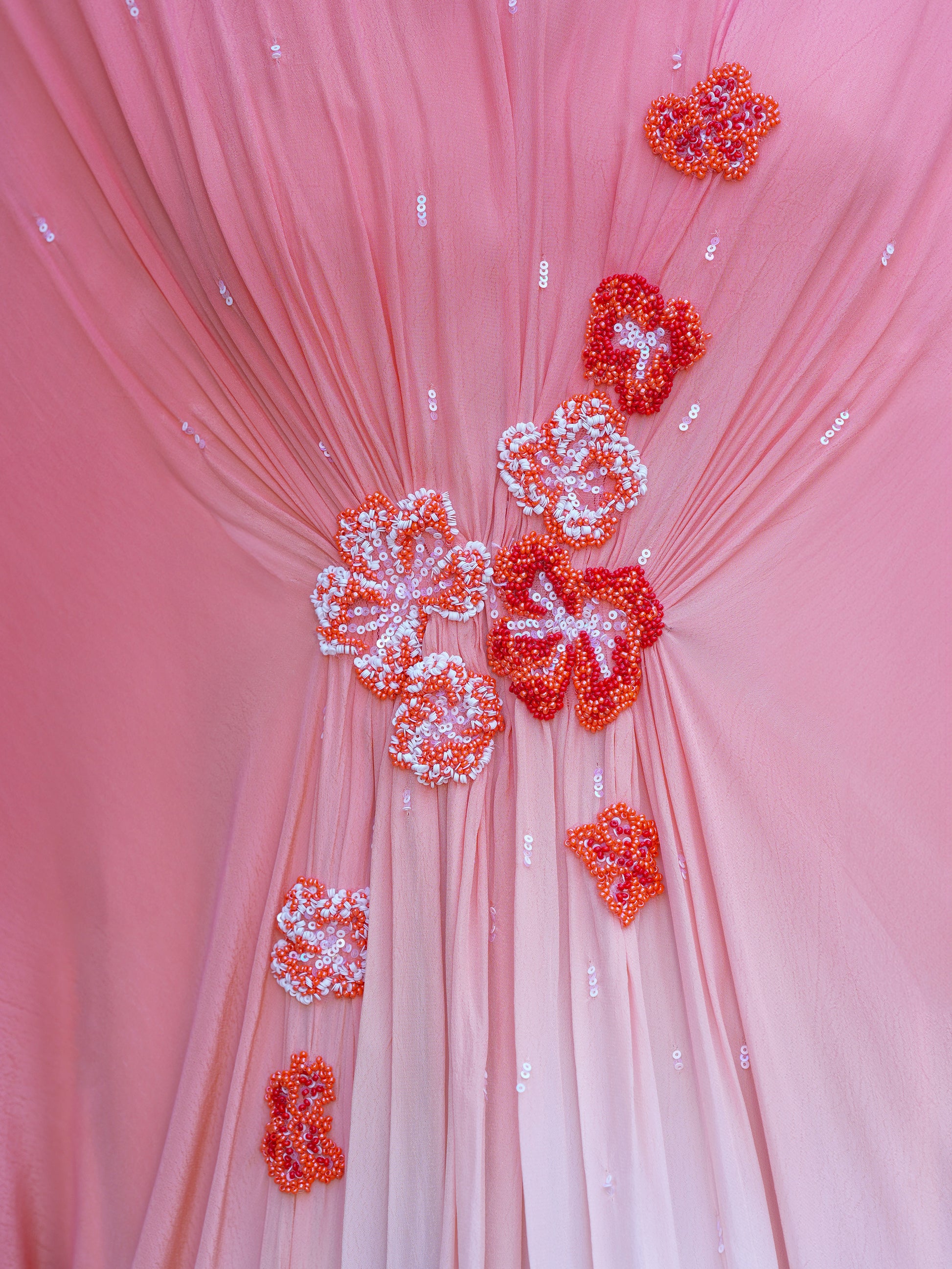 Ombre dyed kaftan dress with gathered detail. Hand-embroidered in abstract floral beadwork. Comes with slip.