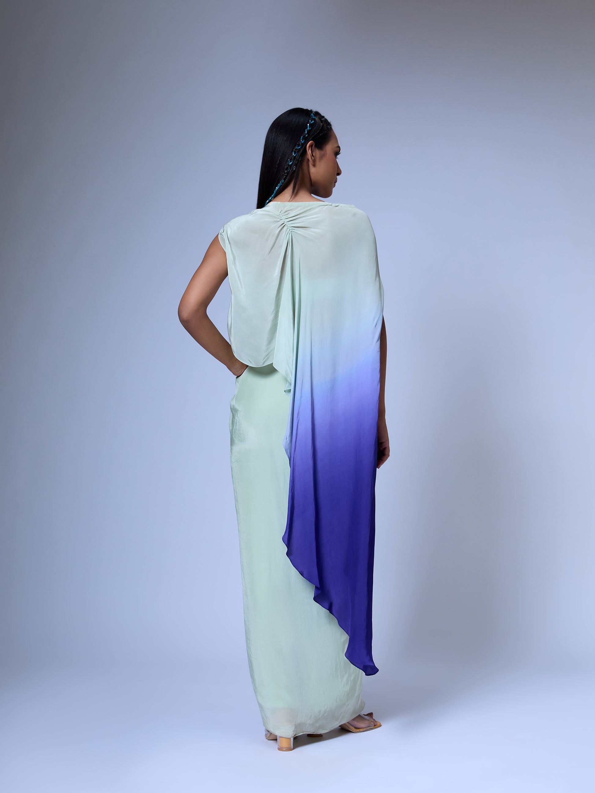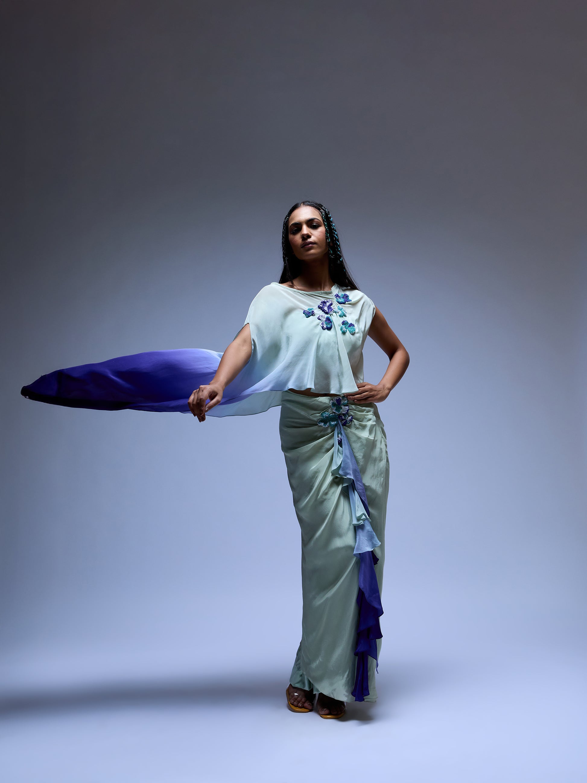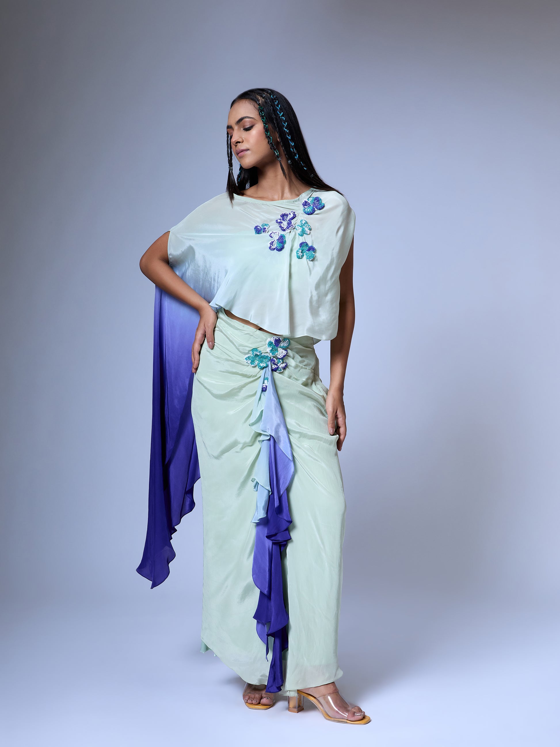 Draped top in our signature floral burst 3D embroidery. Draped skirt with same embroidery and ruffled detail. Ombre dyed. Comes with slip.