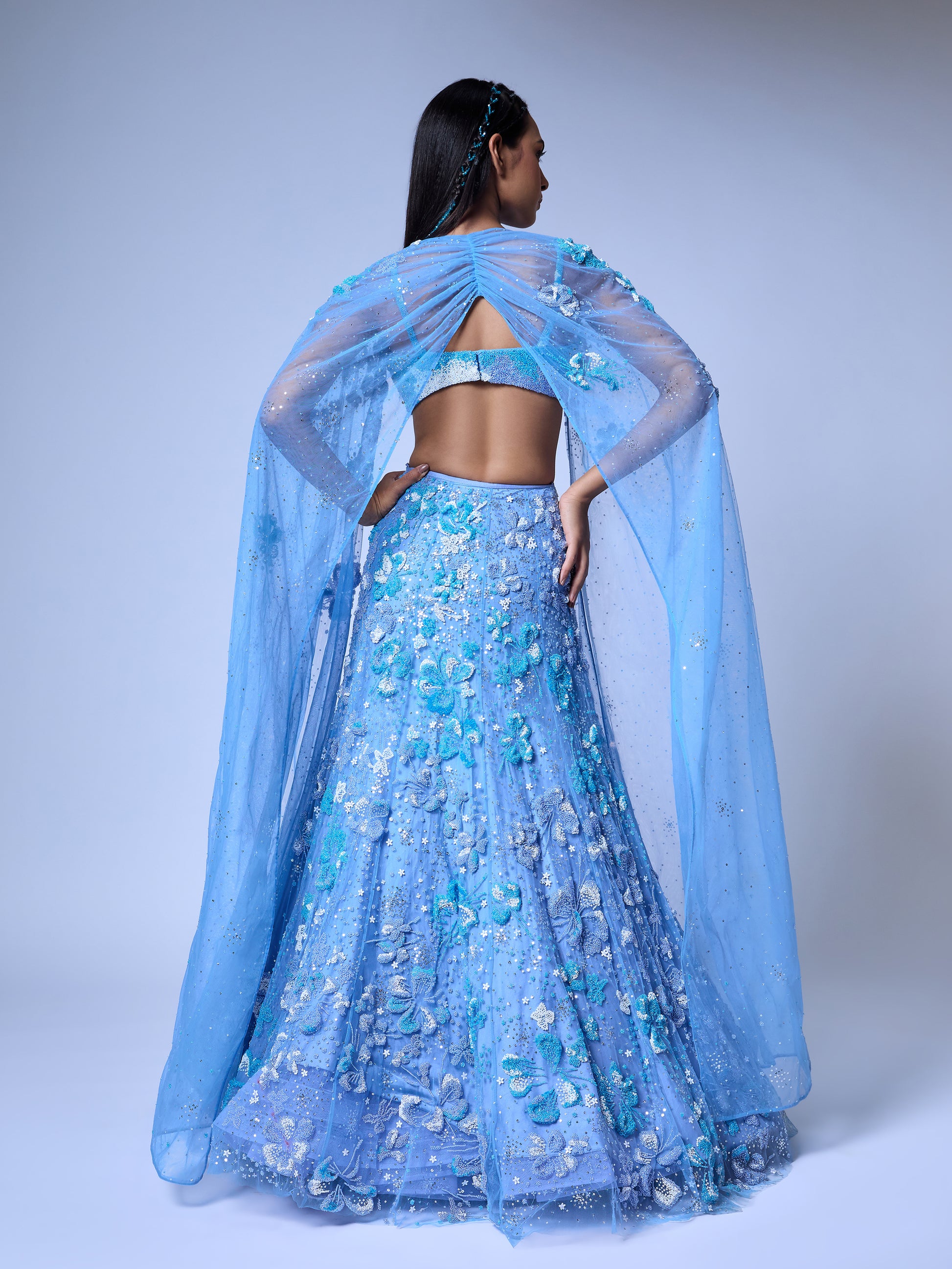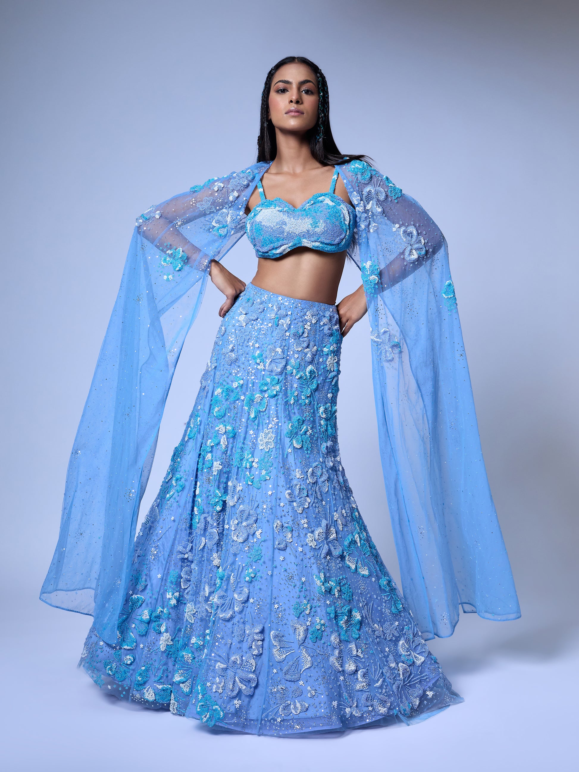 Bustier blouse in our signature micro draping embroidery and beadwork base. Lehenga in 3D floral embroidery with seed beads, sequin and crystals. Paired with a tulle cape in similar embroidery.