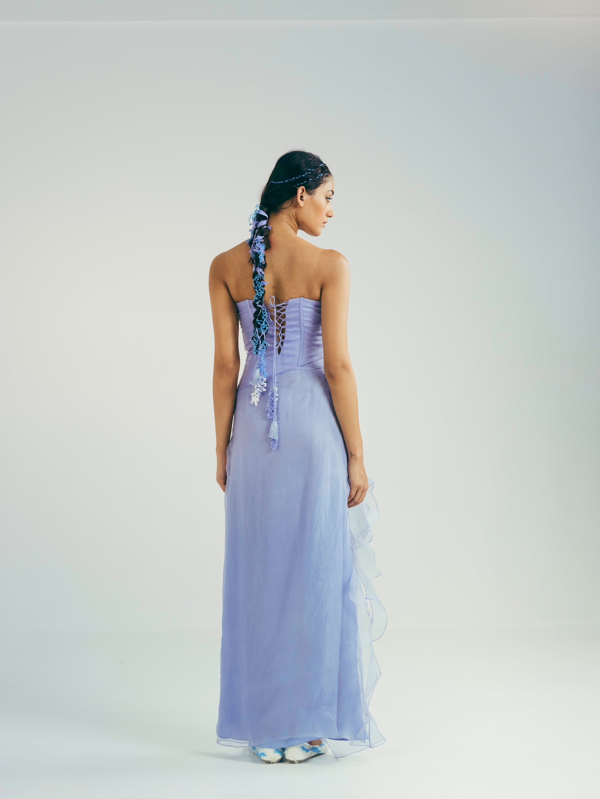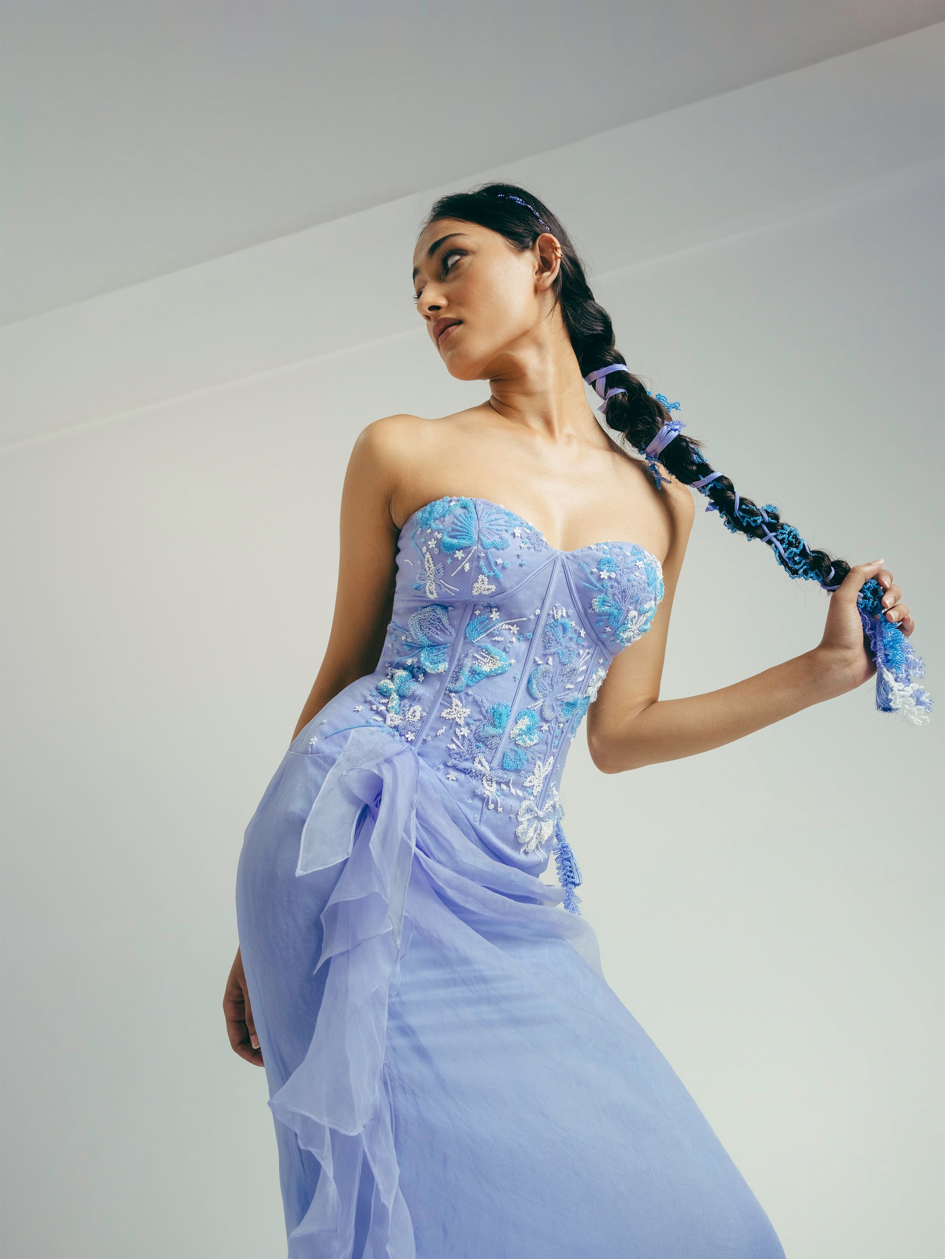 Corseted maxi dress with 3D floral embroidery on body and silk organza draped skirt. Tie-up strap on back finished with tassels. Side seam conceal zipper opening.