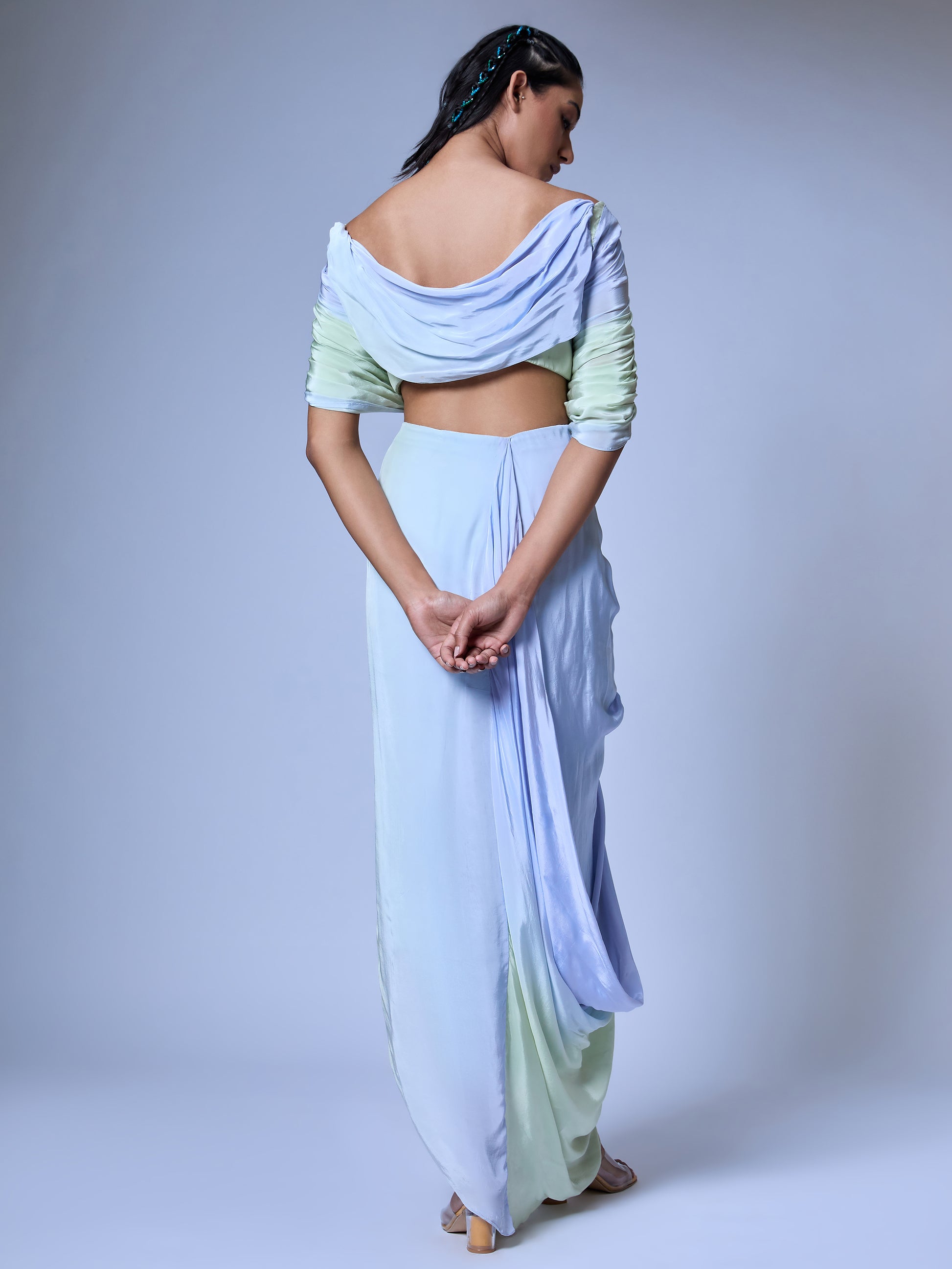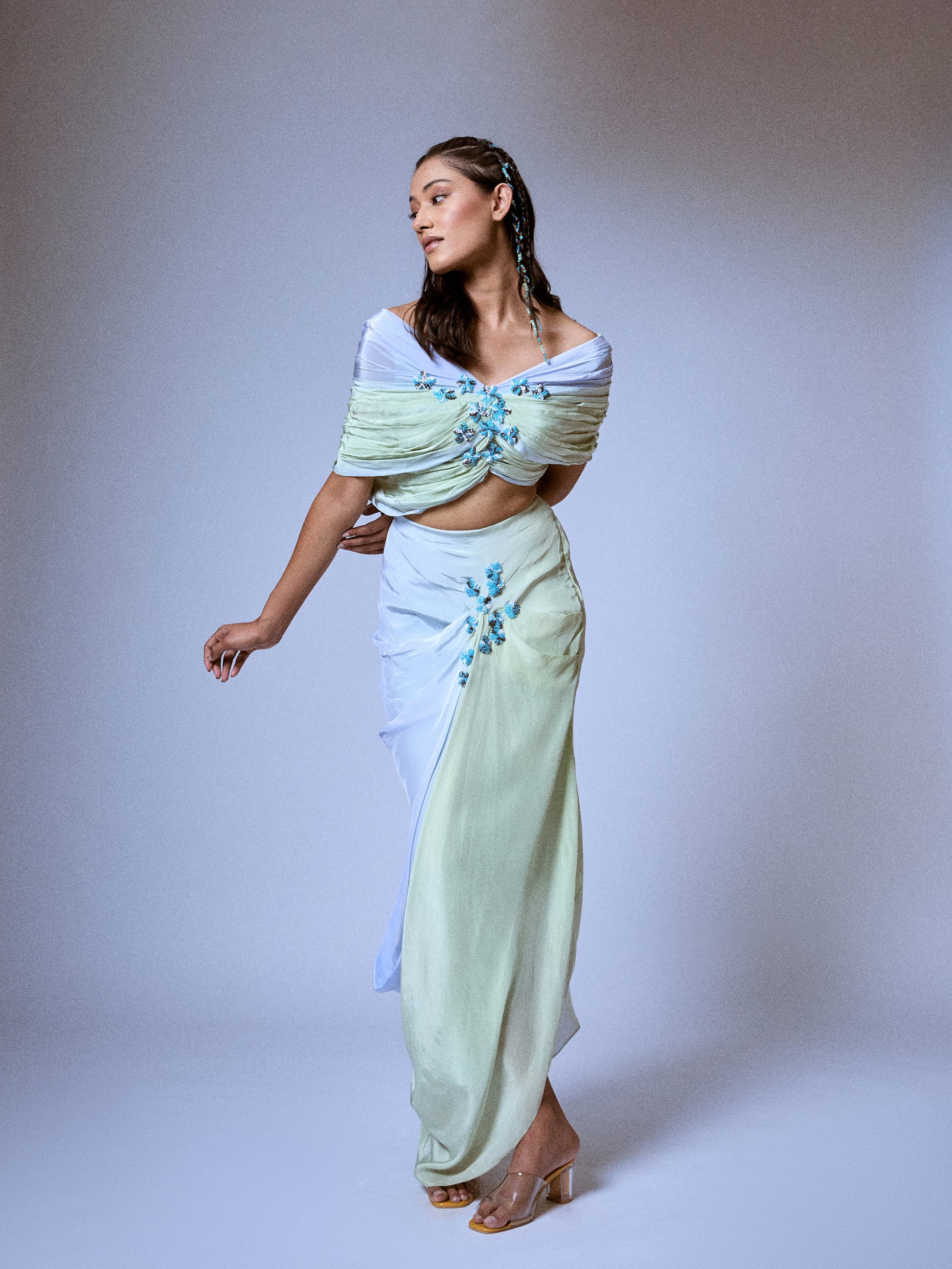 Draped bustier top with ruching. Draped skirt with high low hemline. Both embroidered in micro-floral 3D embroidery. Ombre dyed.