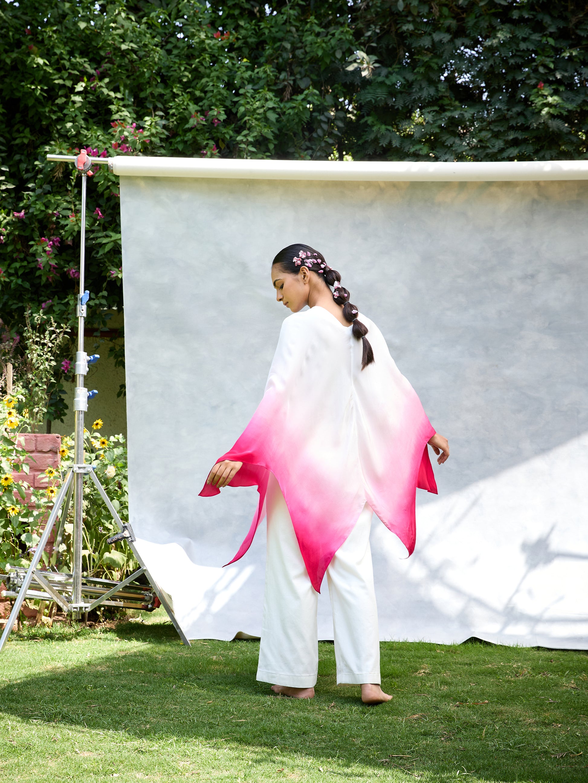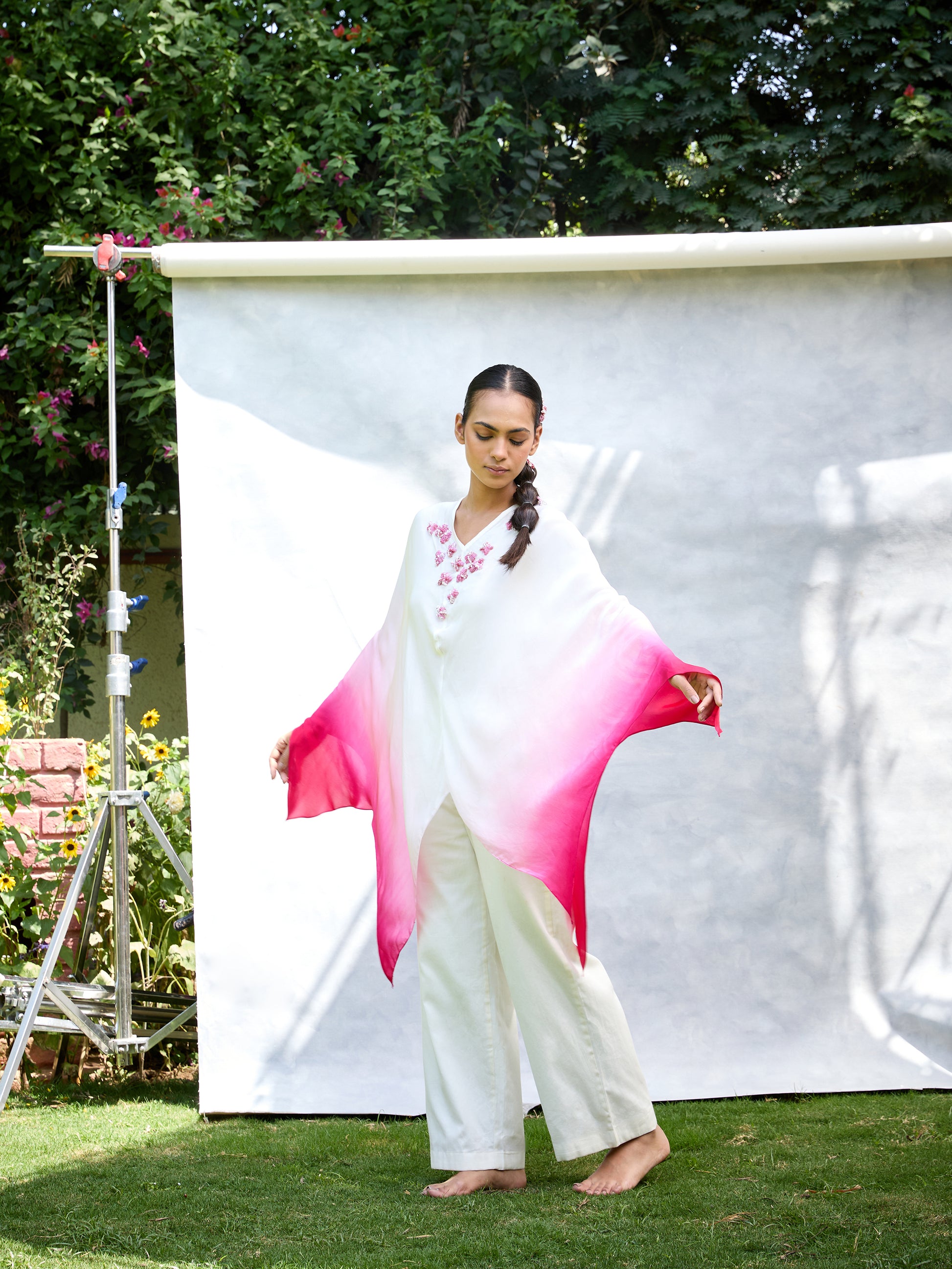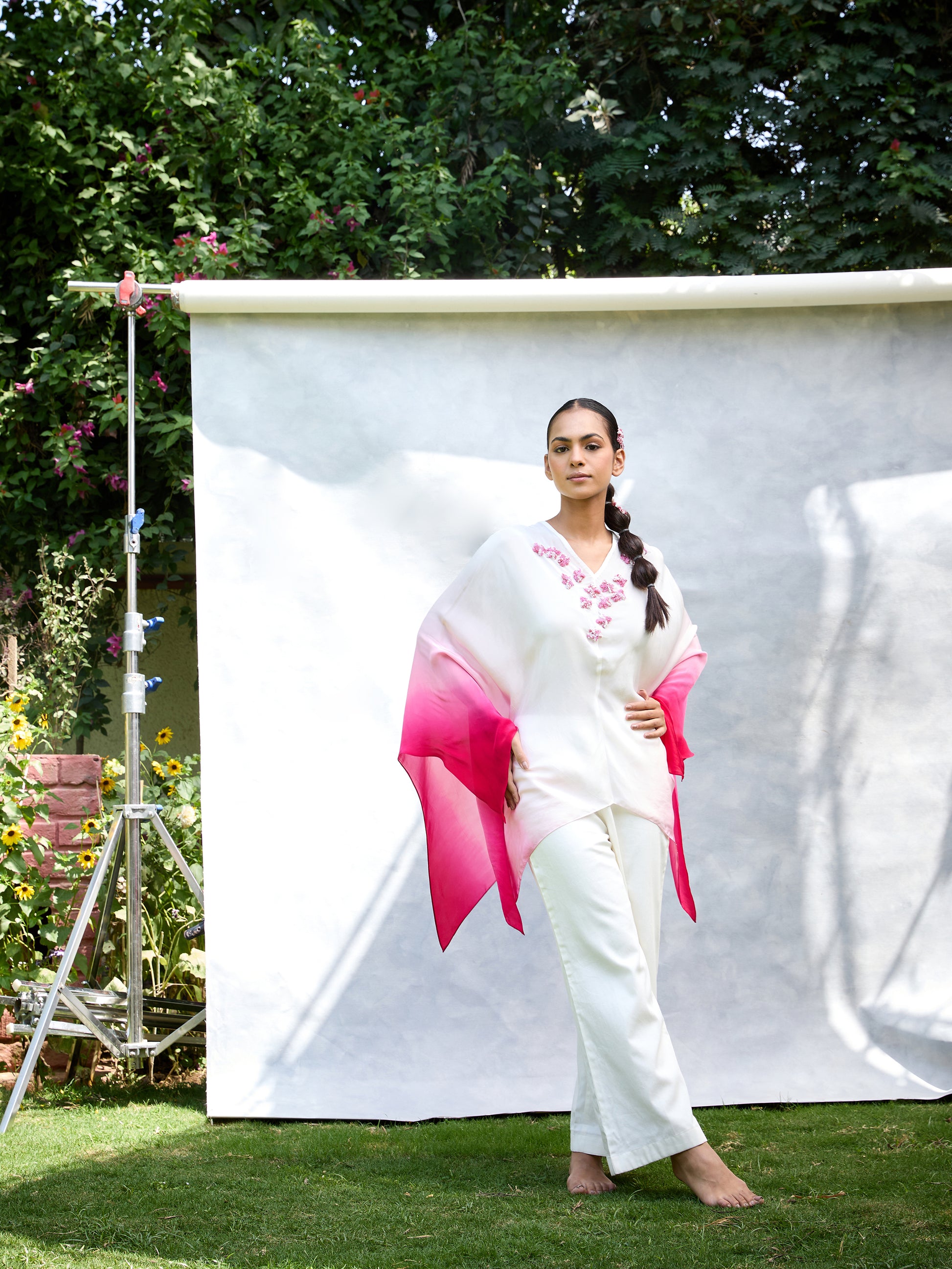 Draped top in micro-floral 3D embroidery on neckline. Ombre dyed.