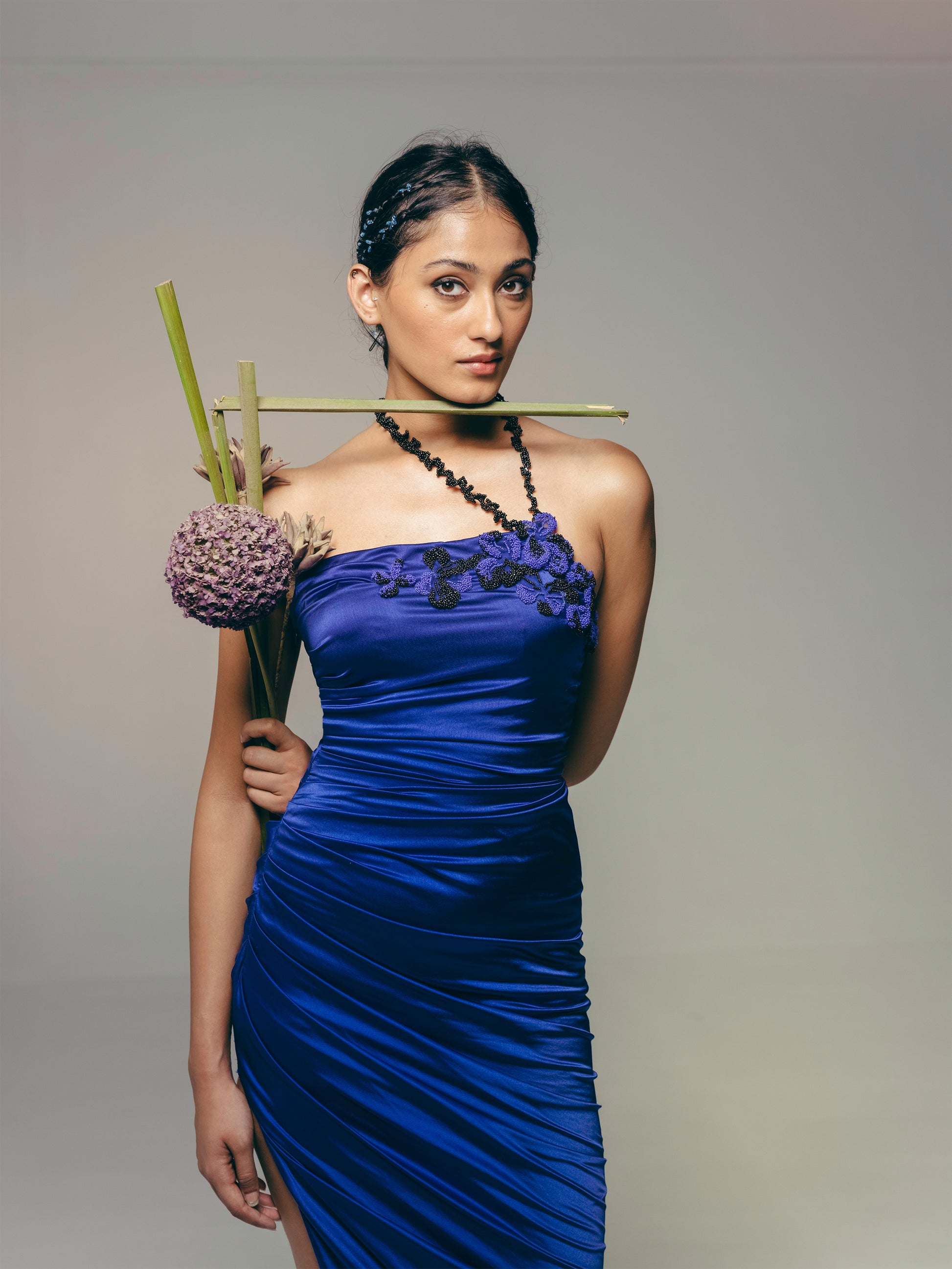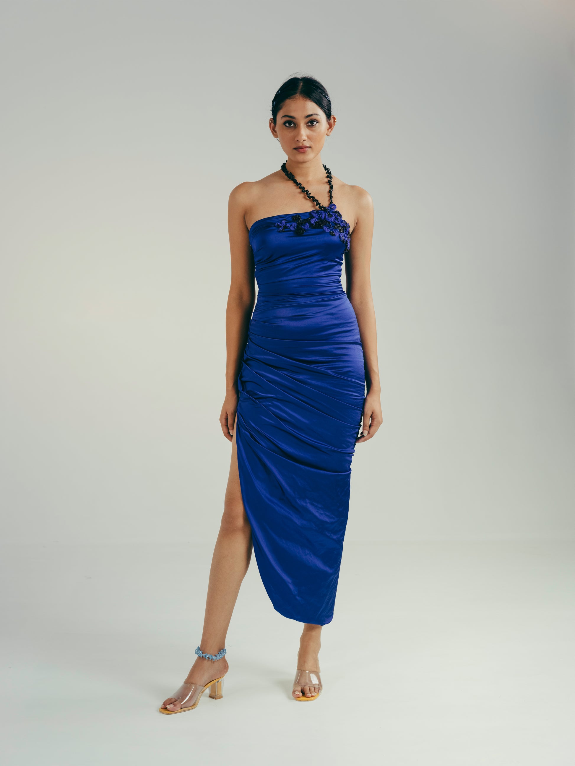 Draped midi dress with 3D floral embroidery on neckline, hand-beaded ruffle strap and high-low hemline. Side seam conceal zipper opening.