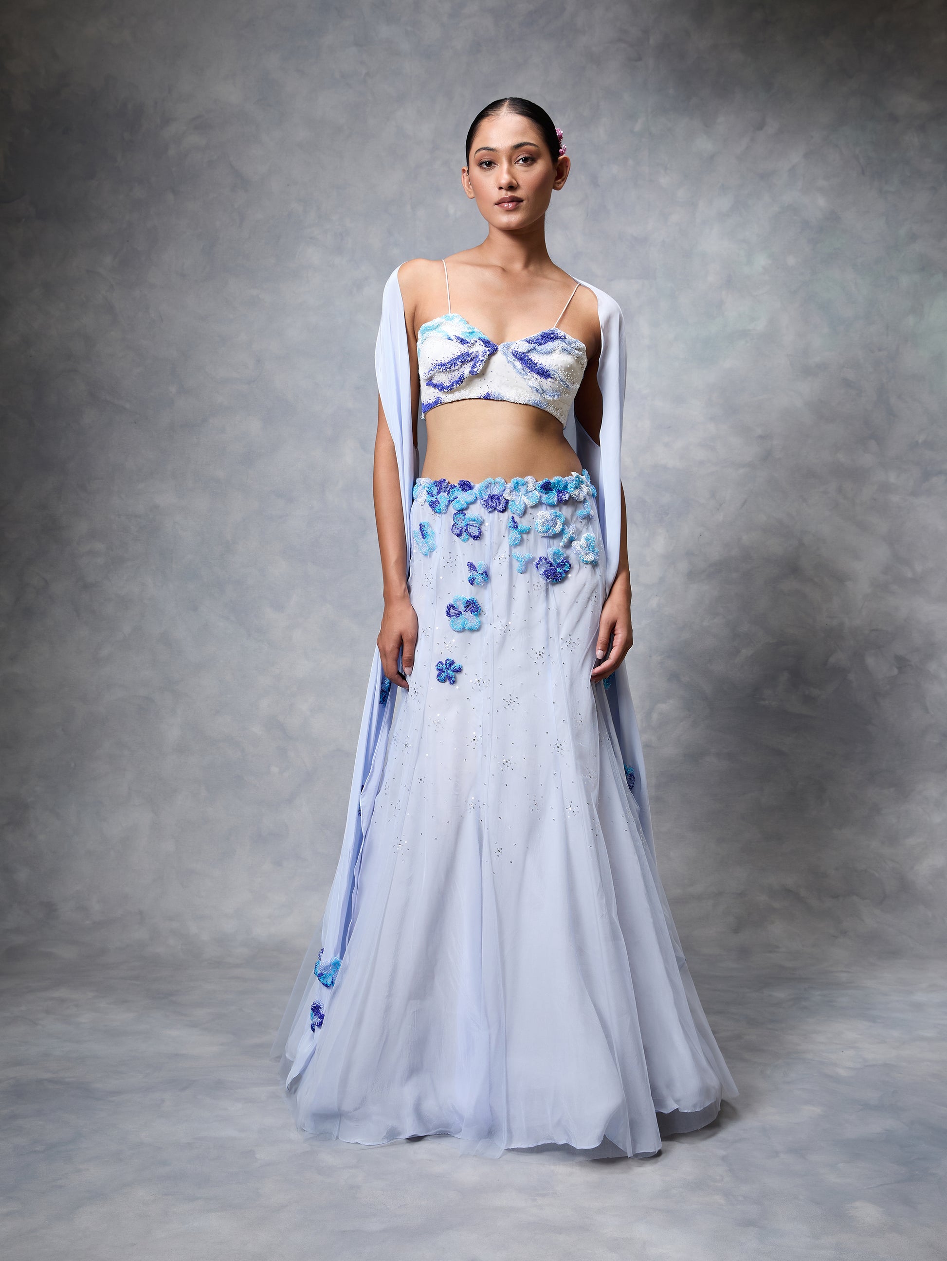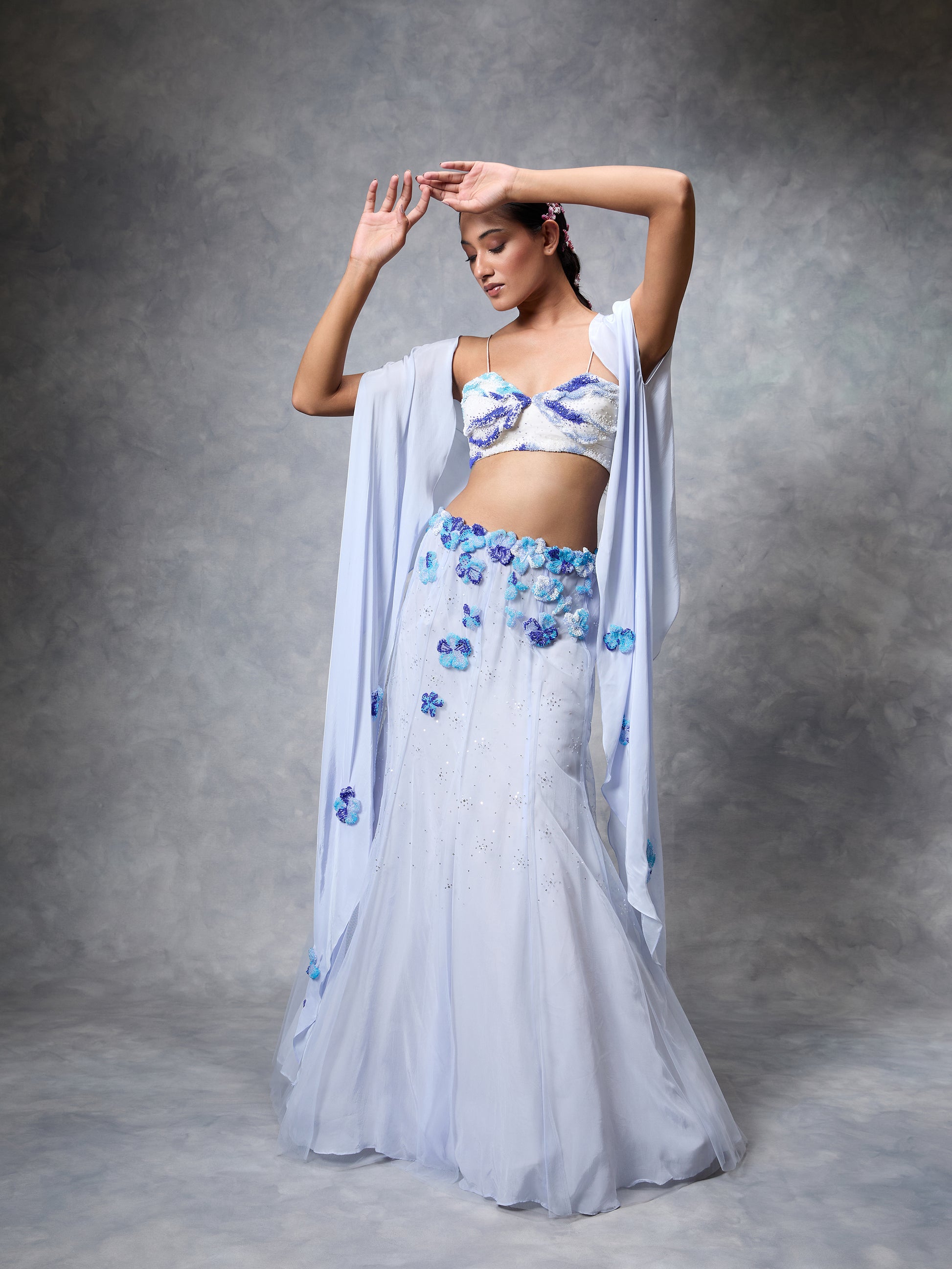 Bustier blouse in our signature 3D microdraping embroidery. Noodle strap. Lehenga with 3D floral burst embroidery in seed beads and sequins. Paired with a cape with hints of same embroidery and finished with tassels. Separate can-can skirt.