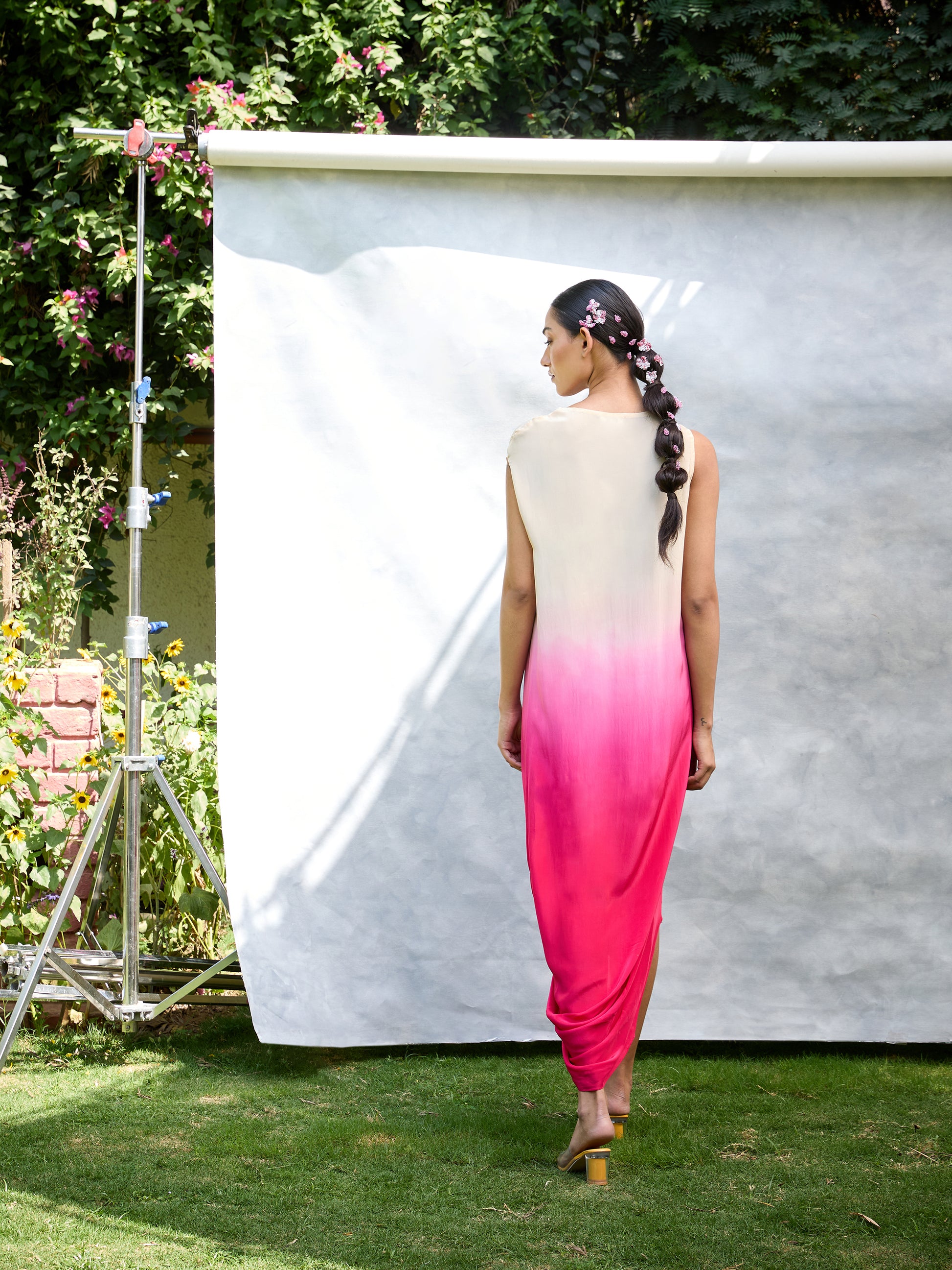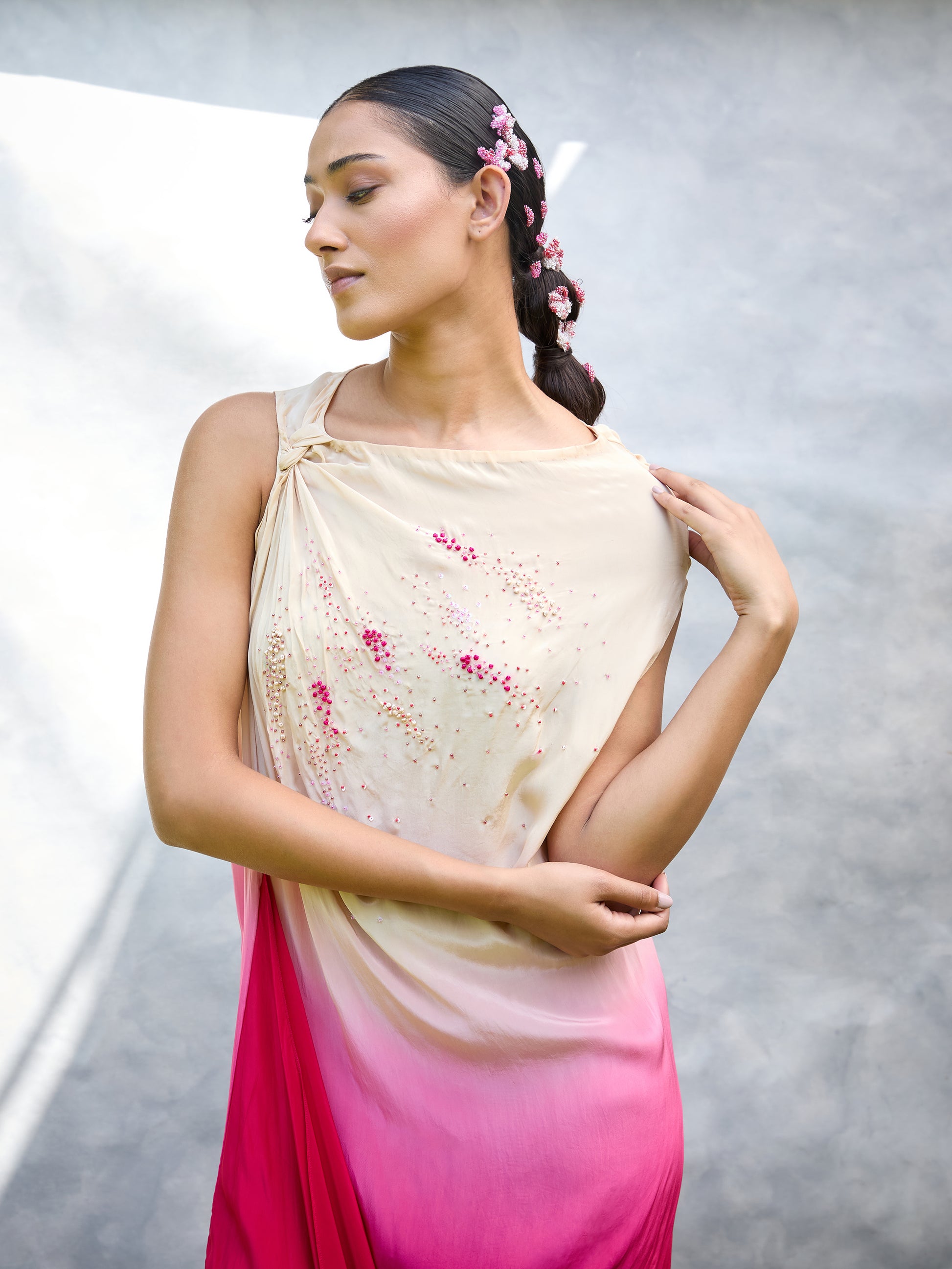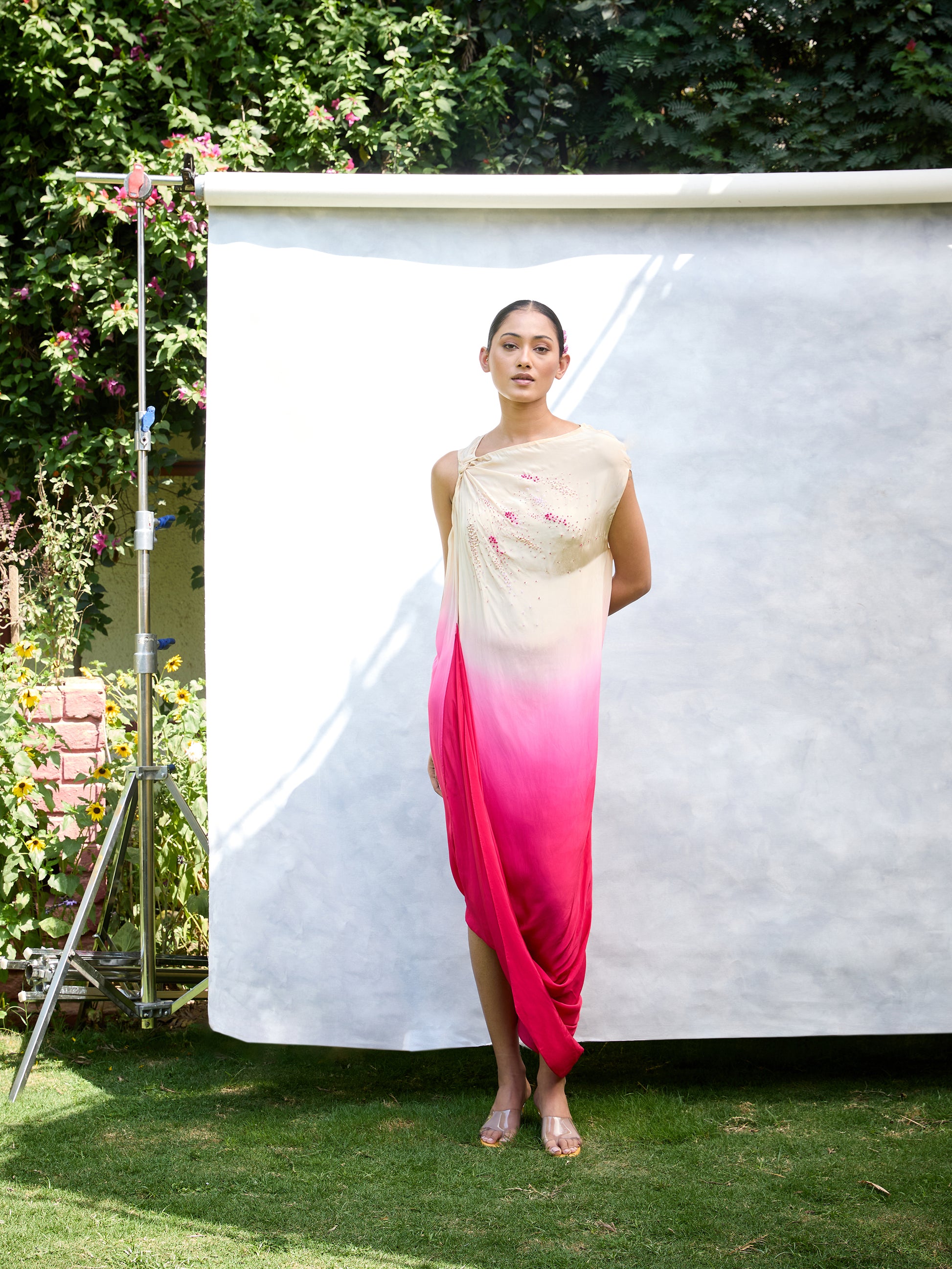 Draped dress in scatter embroidery with sequin, beads and French knots. Ombre dyed.