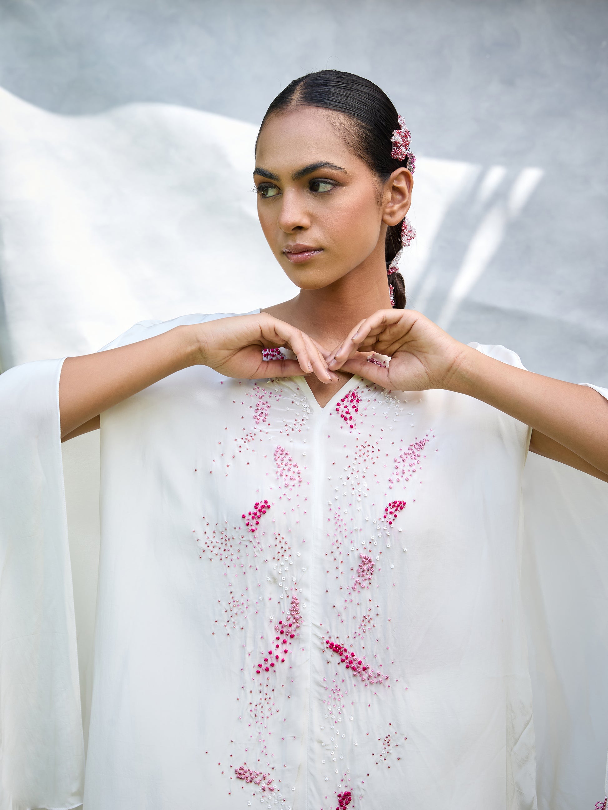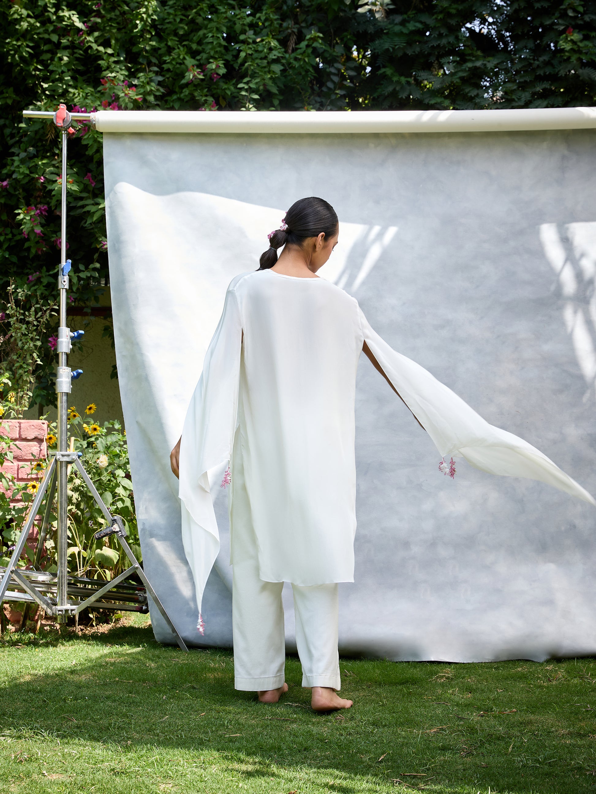 Draped top in scatter embroidery with sequin, beads and French knots. Cape sleeves with tassel details.