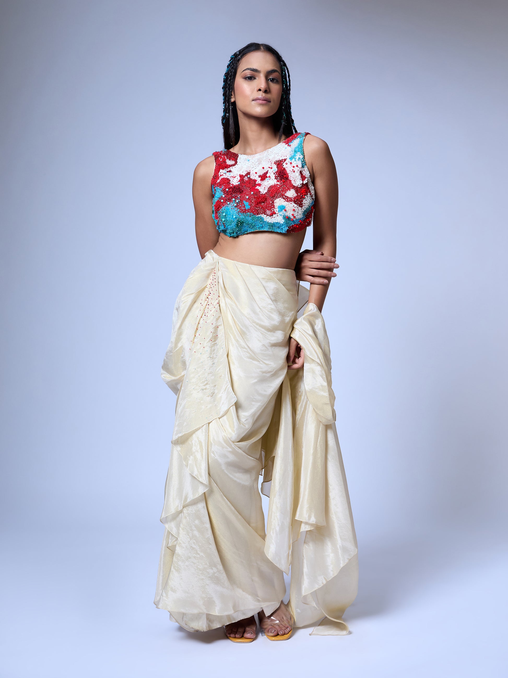 Boat neck blouse in textured beadwork embroidery with seed beads, crystals, French knots etc. Draped skirt with ruffle detailing and embroidery highlights. Paired with draped dupatta with tassels.