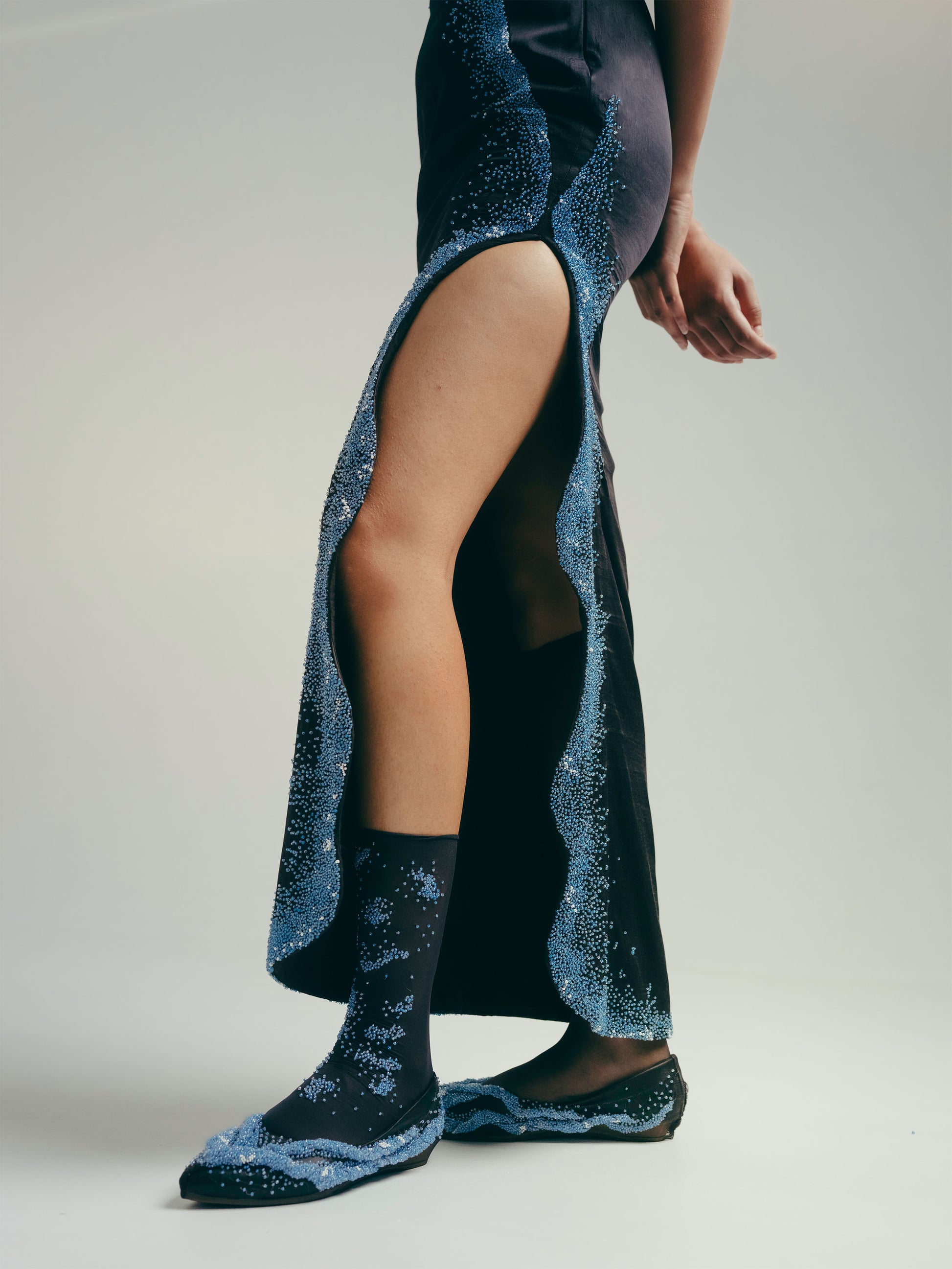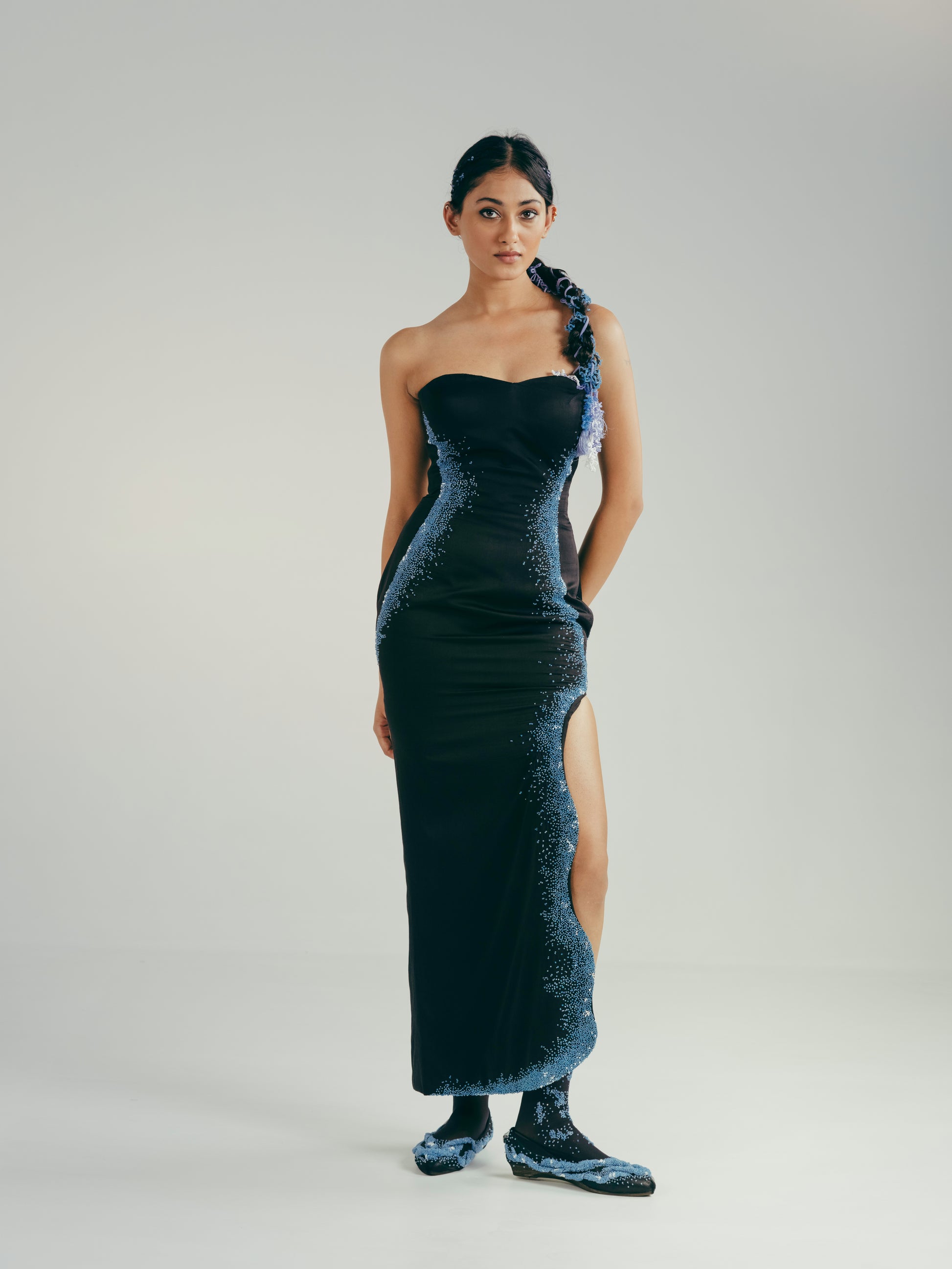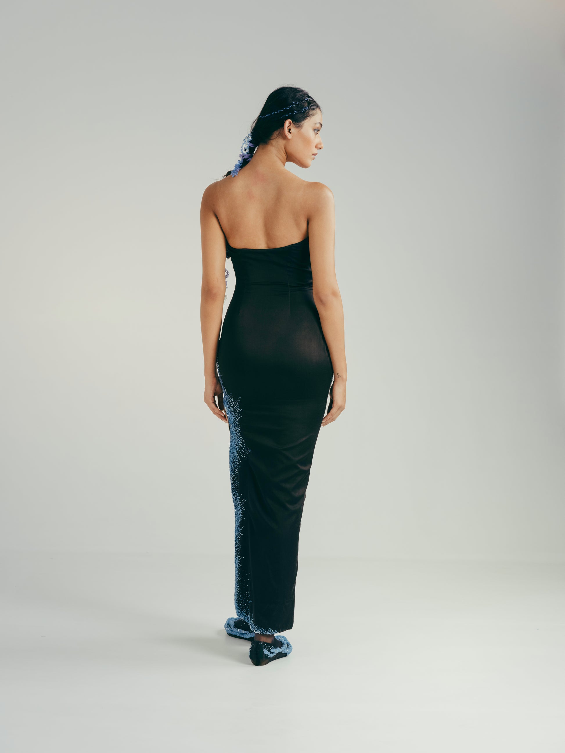Strapless maxi dress with contrast gradient embroidery and curved side slit. Side seam conceal zipper opening.