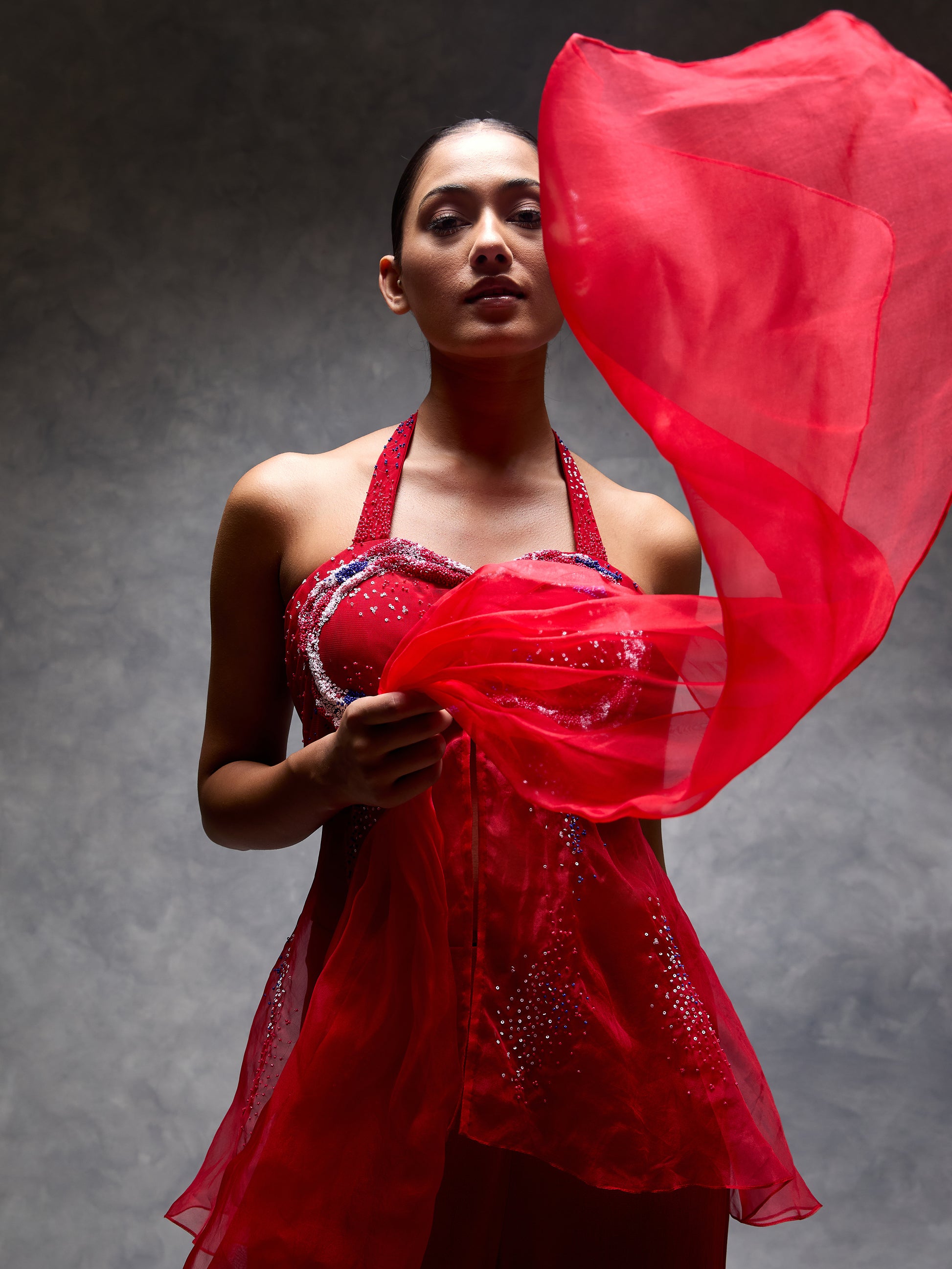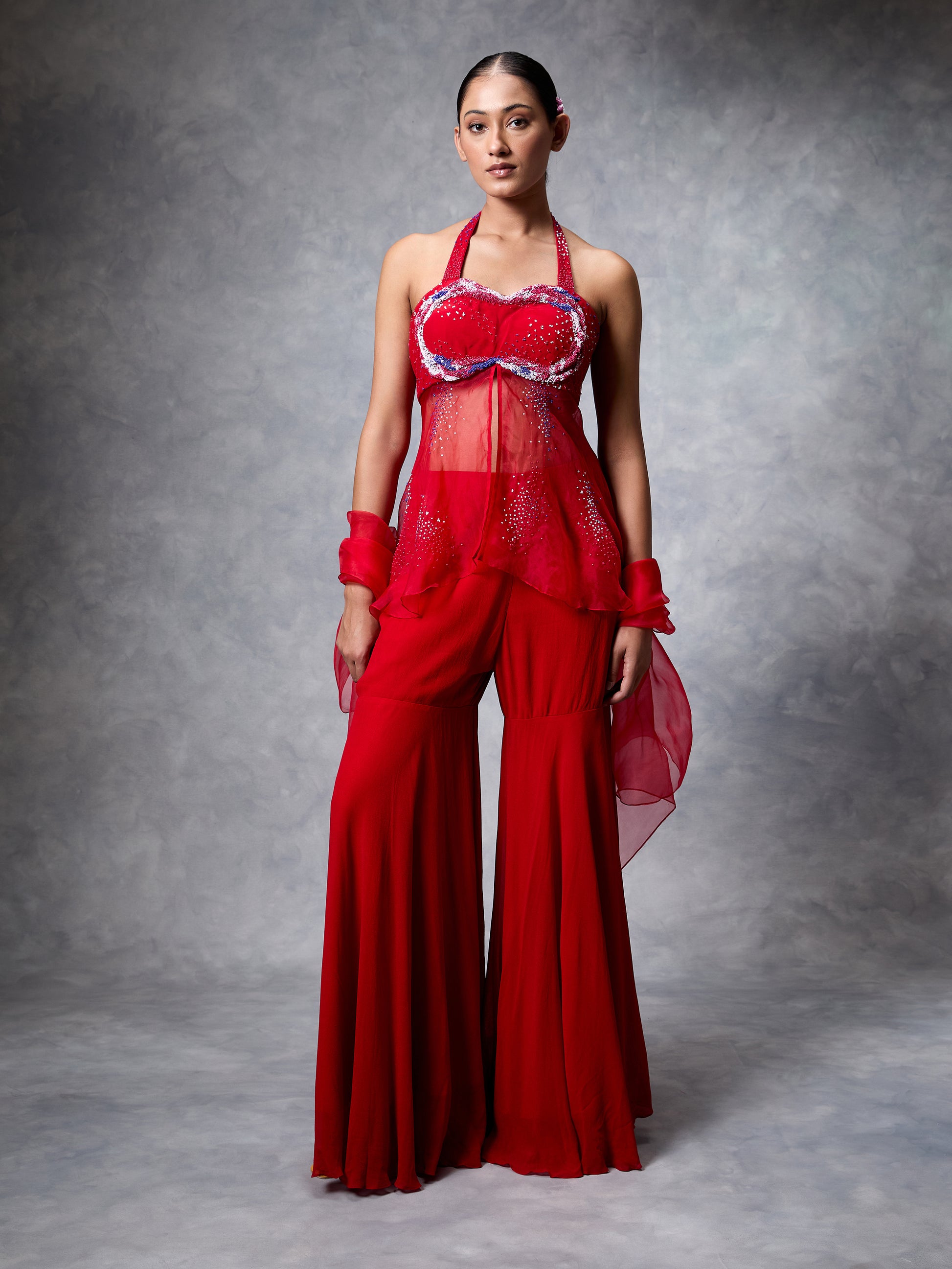 Top with fitted bustier embroidered in signature 3D micro draping embroidery. Attached organza drape with similar embroidery. Paired with gharara pants and an organza dupatta.