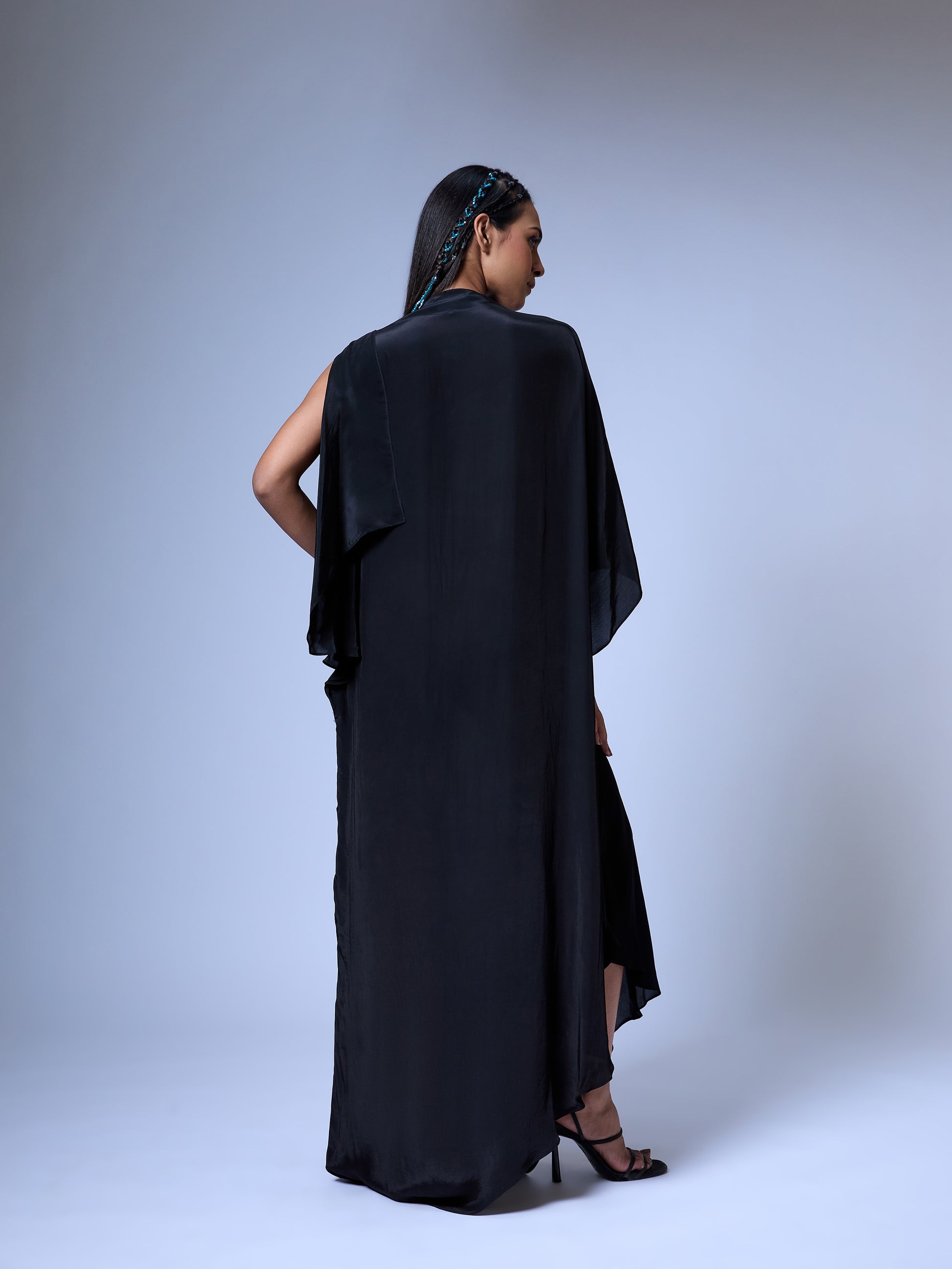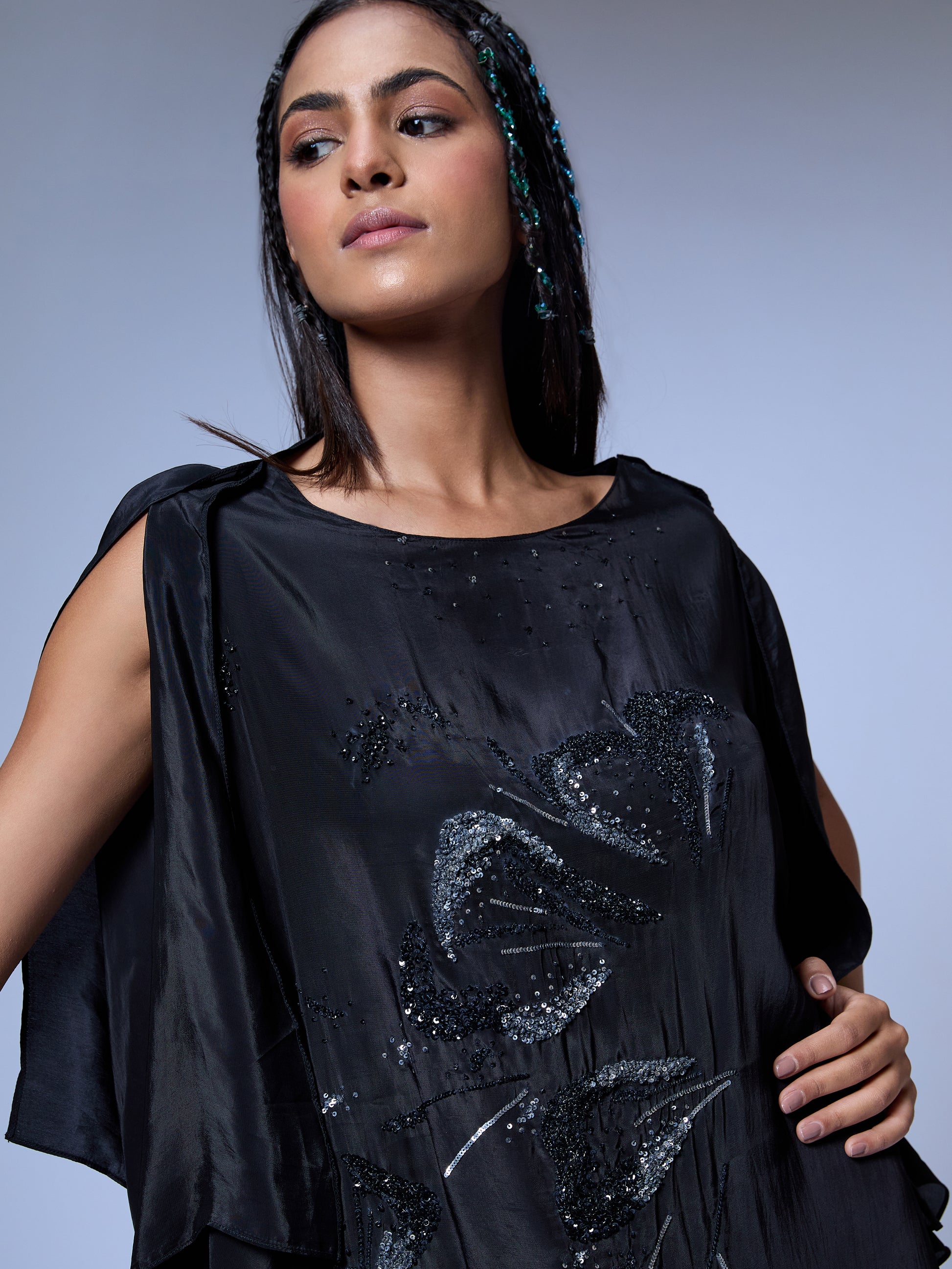 Kaftan dress with floral burst embroidery in sequin. High-low hemline