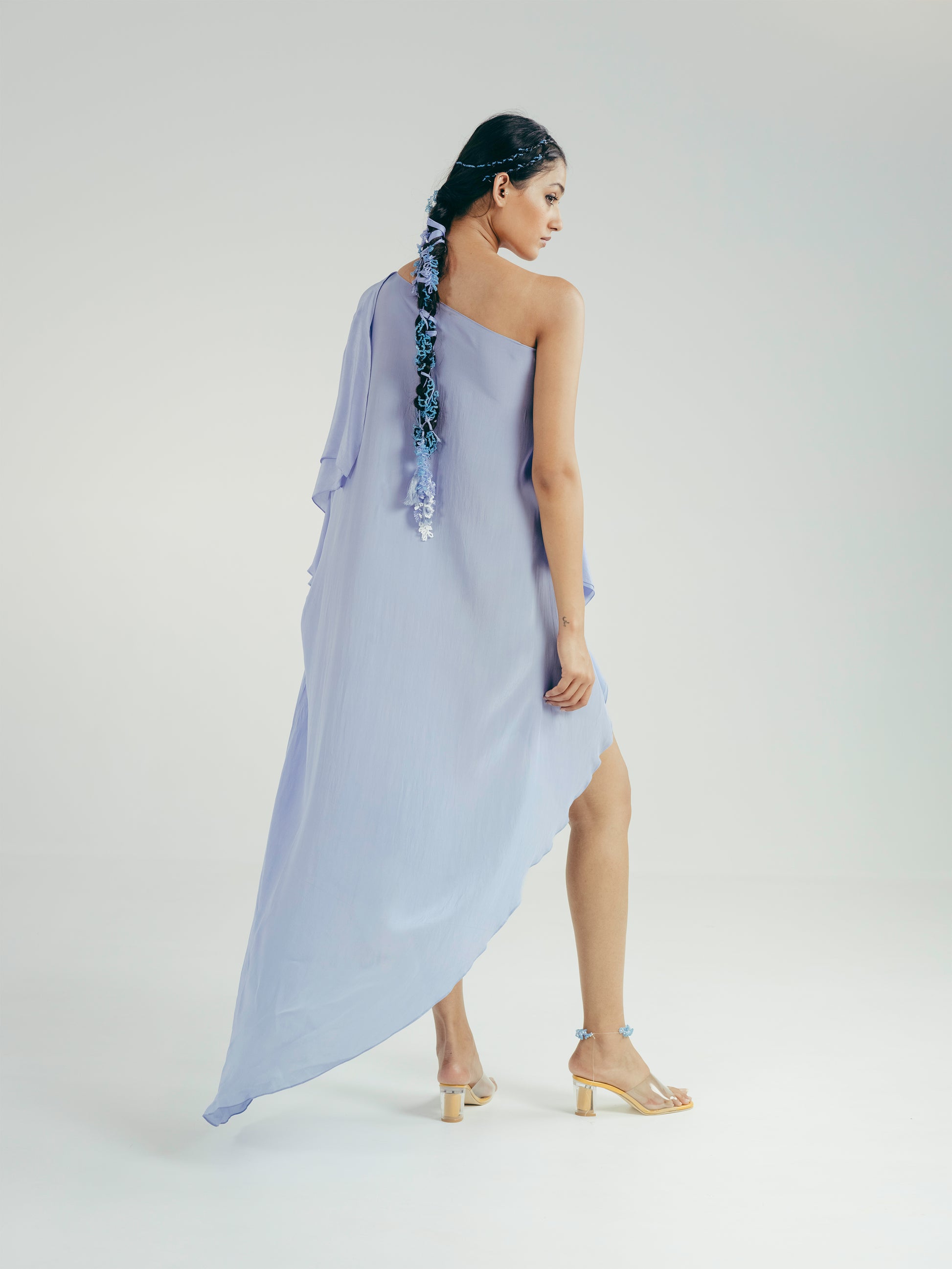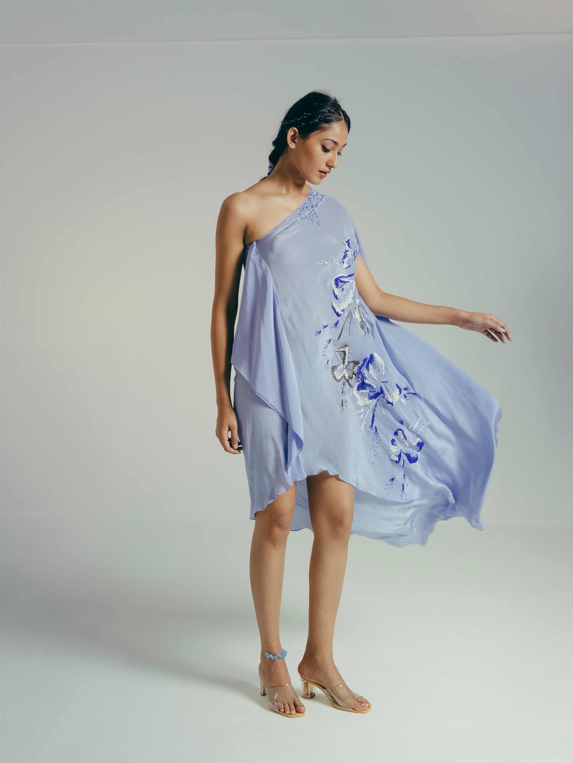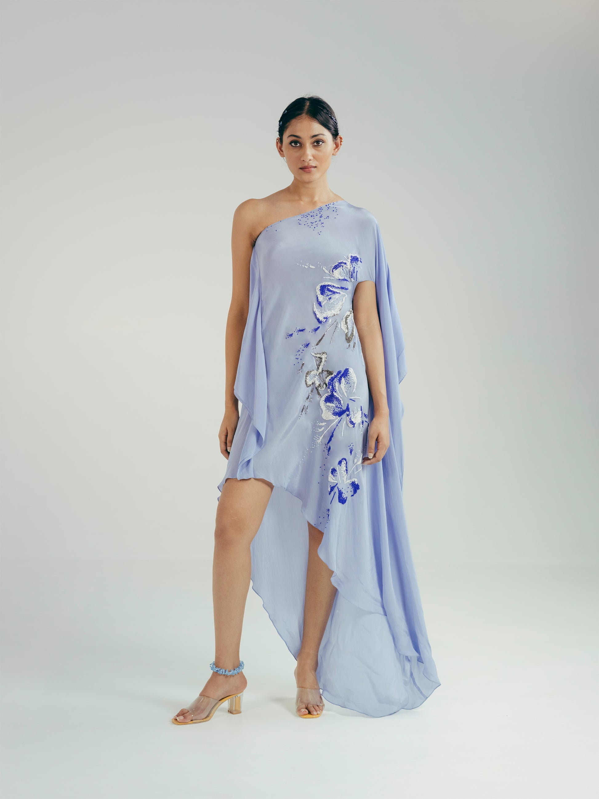 One-shoulder kaftan dress with 3D floral embroidery and asymmetric hemline.