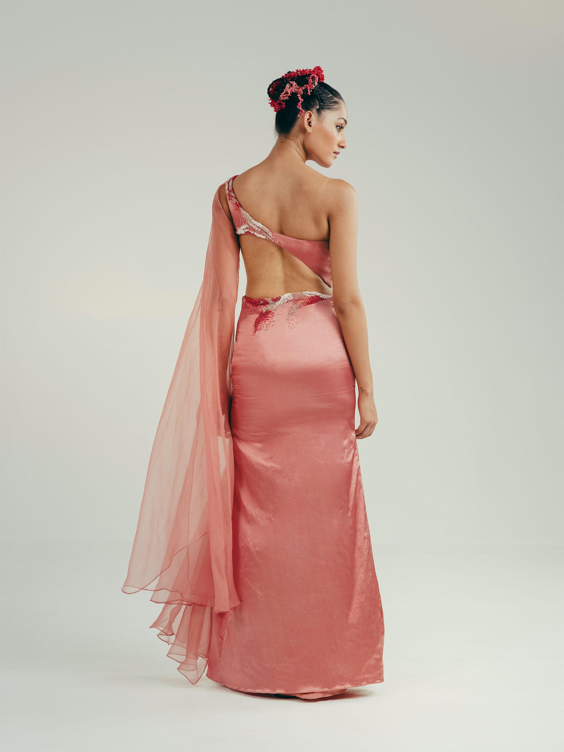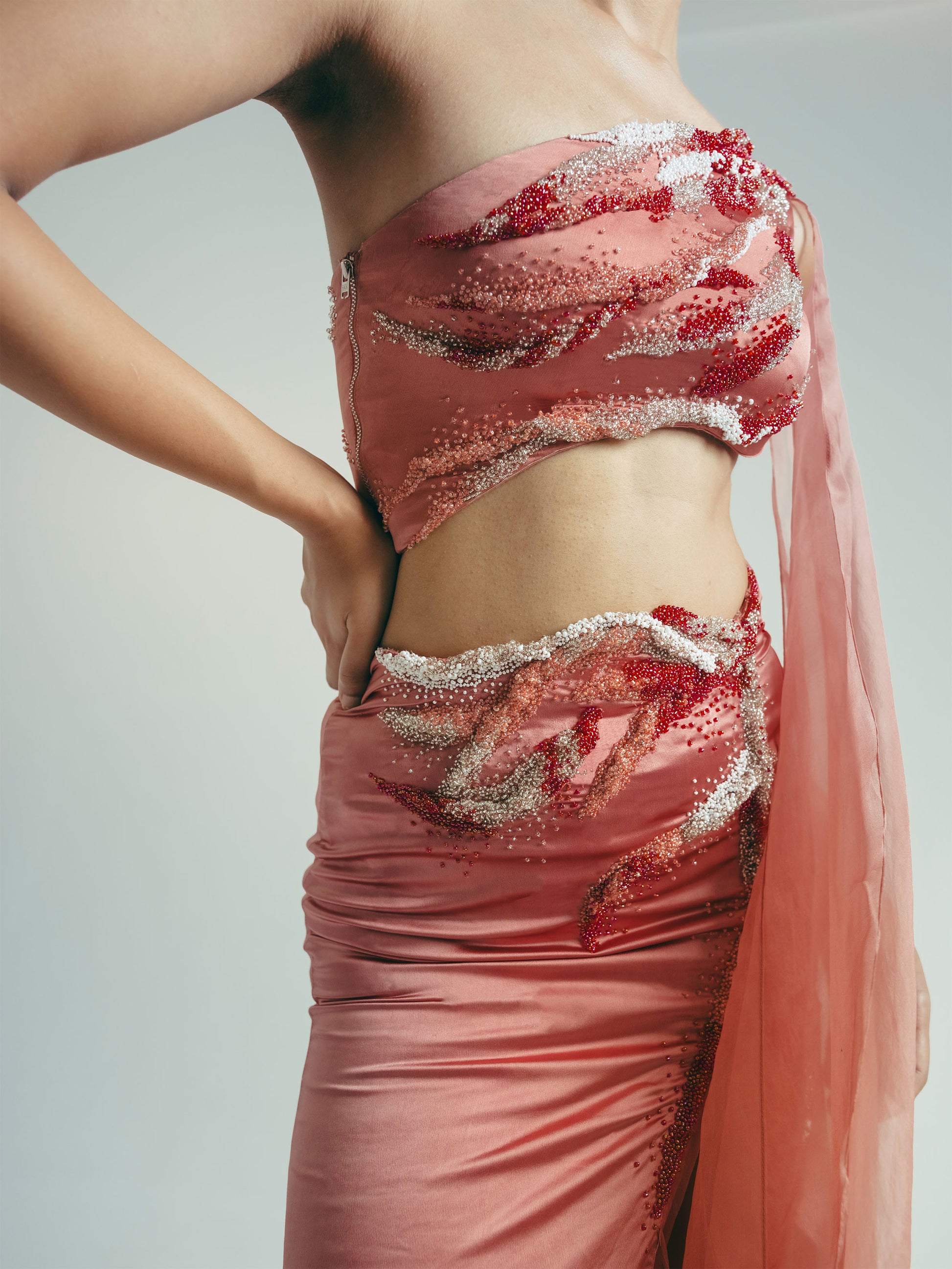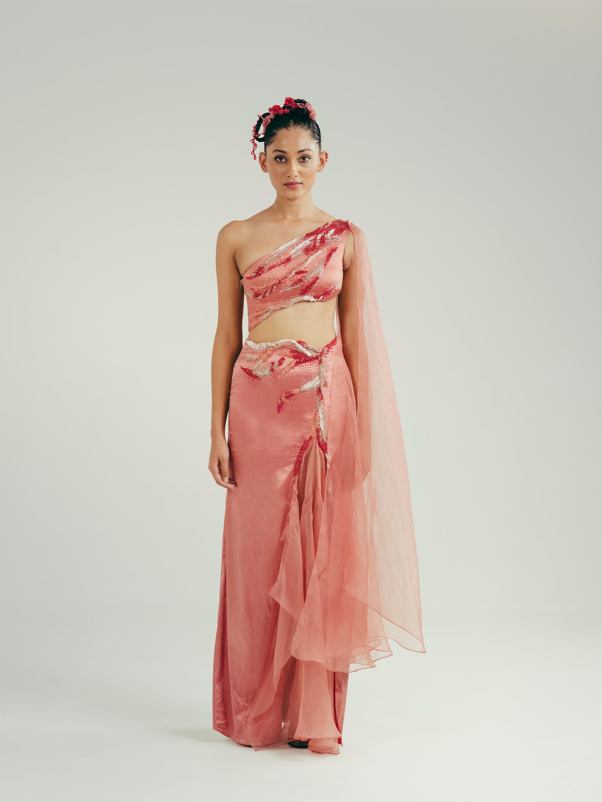 One-shoulder bustier top with gradient micro-draping embroidery, silk organza drape on shoulder and asymmetric hemline. Side seam metal zipper opening. Maxi skirt in same embroidery and fabric with a silk organza drape and slit. Side seam conceal zipper opening.